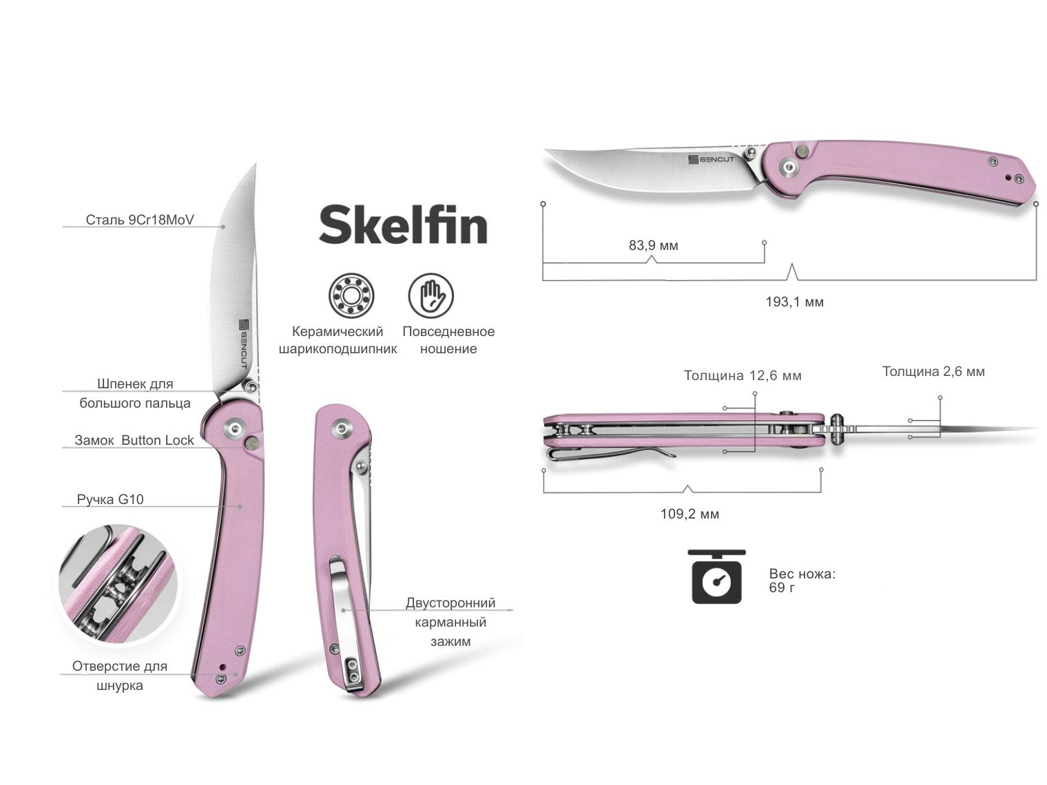 Skelfin — это нож на кнопочном замке Button Lock. Клинок открывается одной рукой с помощью двустороннего шпенька и так же мгновенно закрывается одной рукой. На обухе есть упор под палец для контролируемого реза с усилием.