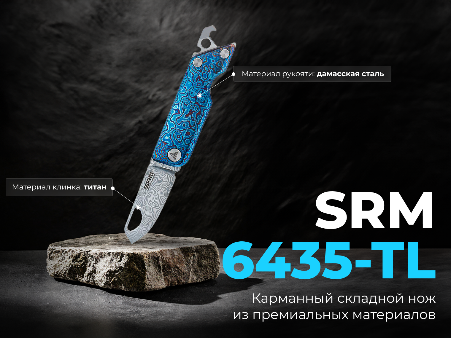 Описание ножа складного карманного SRM 6435, (4.1 см) Damascus / Titanium голубой: