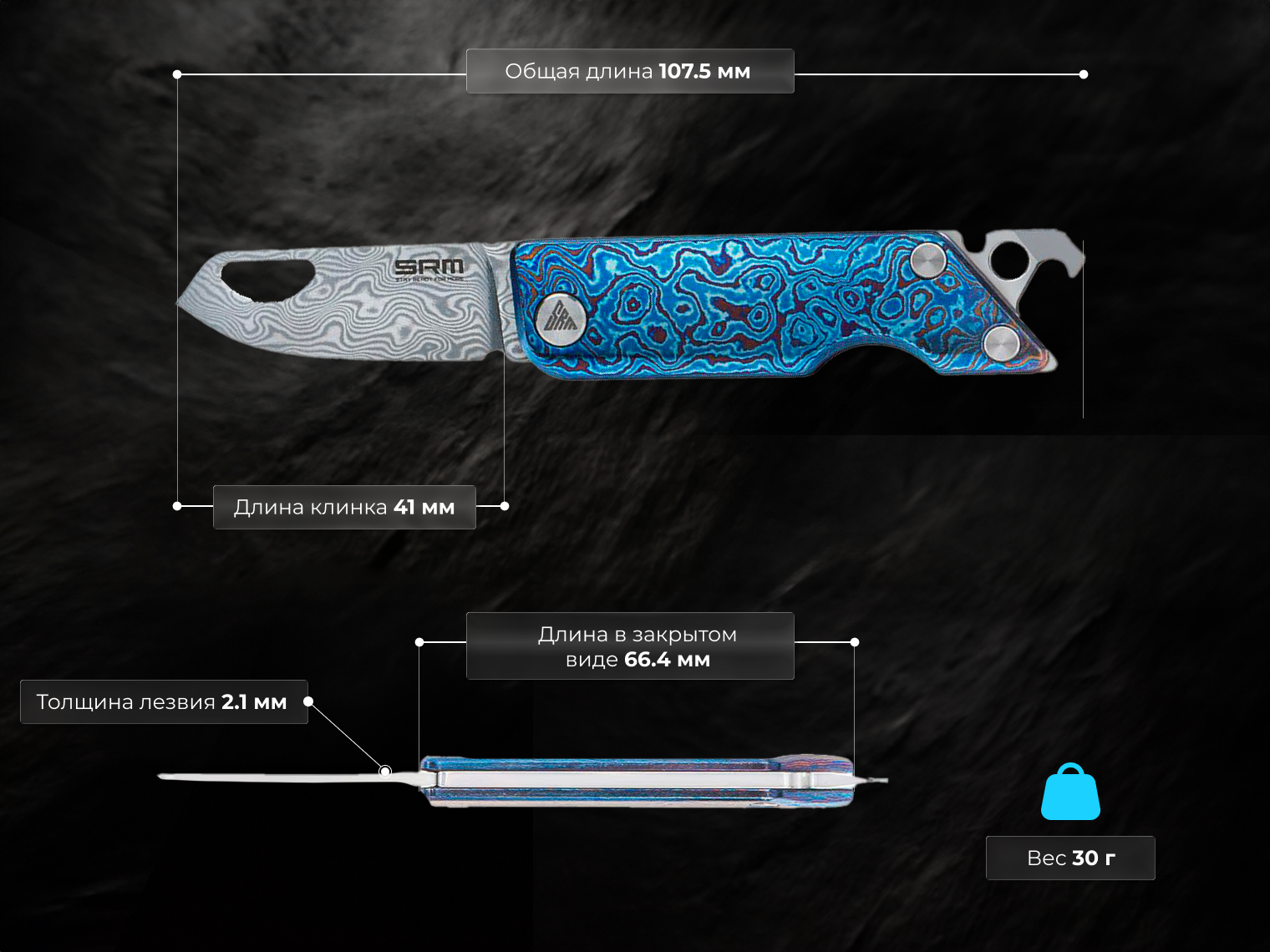 - Рукоять из титана. Выбор титанового сплава обеспечил минимальный вес инструмента (30 г) при сохранении жесткости конструкции. Металл не ржавеет и сохраняет свойства под воздействием влаги или химических сред. Голубое анодирование и узор на поверхности устойчивы к износу и повторяют графику дамасского лезвия.