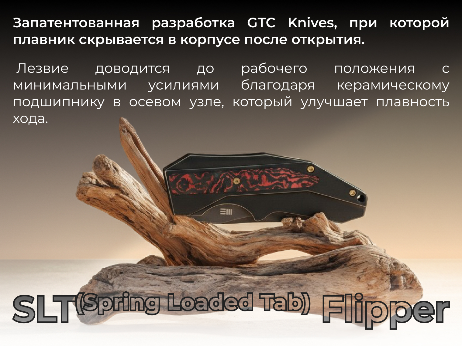 Для открытия WeKnife Coral используется уникальный механизм SLT (Spring Loaded Tab) Flipper — запатентованная разработка GTC Knives, при которой плавник скрывается в корпусе после открытия. Осевой узел работает на керамических подшипниках, что обеспечивает безупречно быстрое открытие без лишних усилий.