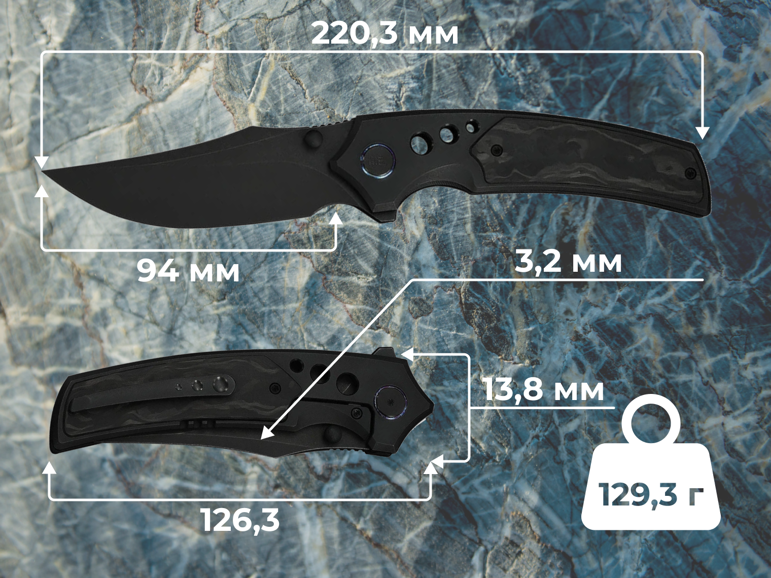 - материал рукояти — титан 6AL4V + вставки Marble Carbon Fiber;