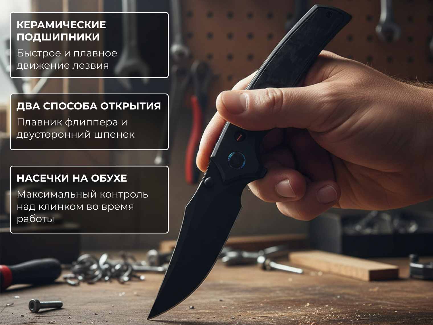 Сердцем ножа является замок Bolster Lock, который надежно фиксирует лезвие, а система керамических шарикоподшипников гарантирует мгновенный и плавный выход клинка. Форма Clip Point с плоскими спусками обеспечивает отличную проникающую способность и контролируемый чистый рез. Черное матовое покрытие Stonewashed не только придает ножу тактический вид, но и эффективно скрывает следы эксплуатации.