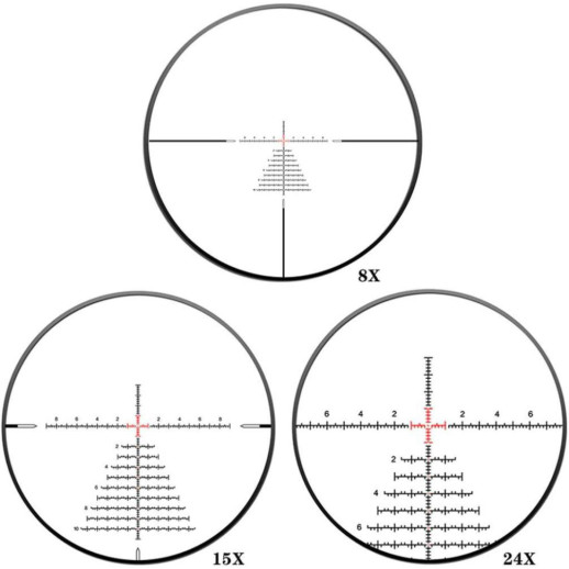 Прицельная сетка на основе Mil-dot имеет метрическую размерность в MRAD — тонкая и удобна для введения поправок по делениям как в по вертикали, так и по горизонтали, с учетом внешних факторов, влияющих на траекторию полета пули. Сетка выгравирована на стекле и расположена в первой фокальной плоскости FFP ( First Focal Plane). Оснащена подсветкой красного цвета - подсвечивается небольшое центральное перекрестие (6 уровней яркости).