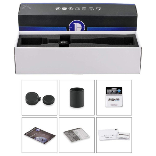 Комплектация | Прицел; Инструкция; Солнцезащитная бленда; Карточка характеристик; Защитные крышки; Салфетка; Рычаг регулировки кратности |