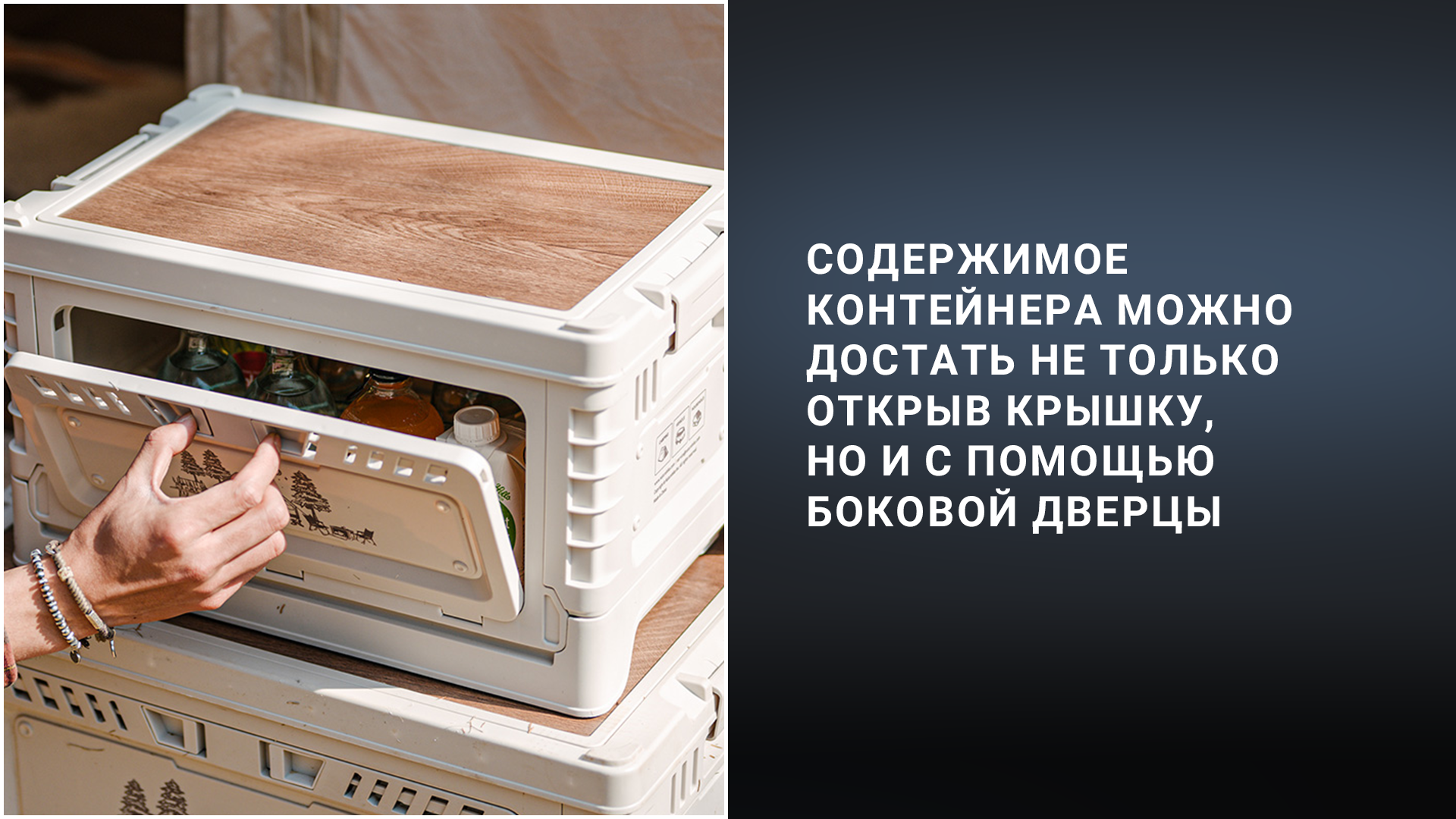 Предметы можно помещать и доставать из контейнера несколькими способами: открывая верхнюю крышку или боковую дверцу. Для открытия дверцы достаточно нажать на фиксирующий механизм двумя пальцами, что можно делать одной рукой.