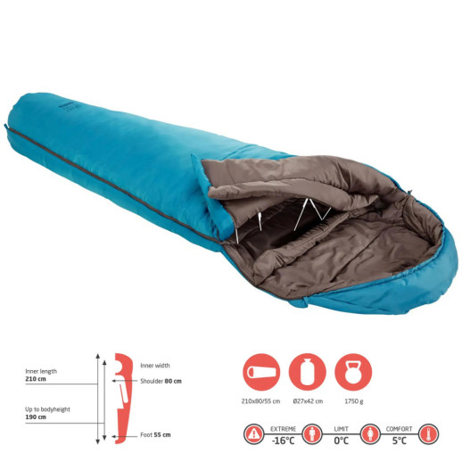 - Наполнитель: Micro Polyester Hollow Fibre (синтетический утеплитель, который характеризуется отличным соотношением теплоизоляционных свойств к собственному весу, а также имеет минимальную остаточную деформацию. Полые микроволокна впитывают и отводят влагу на внешний материал спального мешка).Молния: левая, двусторонняя