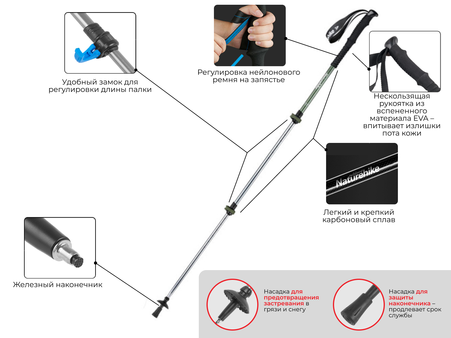 Naturehike ST07 NH18D010-Z — это треккинговые палки, предназначенные для поддержания баланса и устойчивости пользователя во время туристических походов и горных восхождений. Аксессуары имеют регулируемую длину от 115 до 135 см, что позволяет адаптировать их под индивидуальные предпочтения и тип маршрута. Фиксация сегментов на нужной высоте осуществляется с помощью замков.