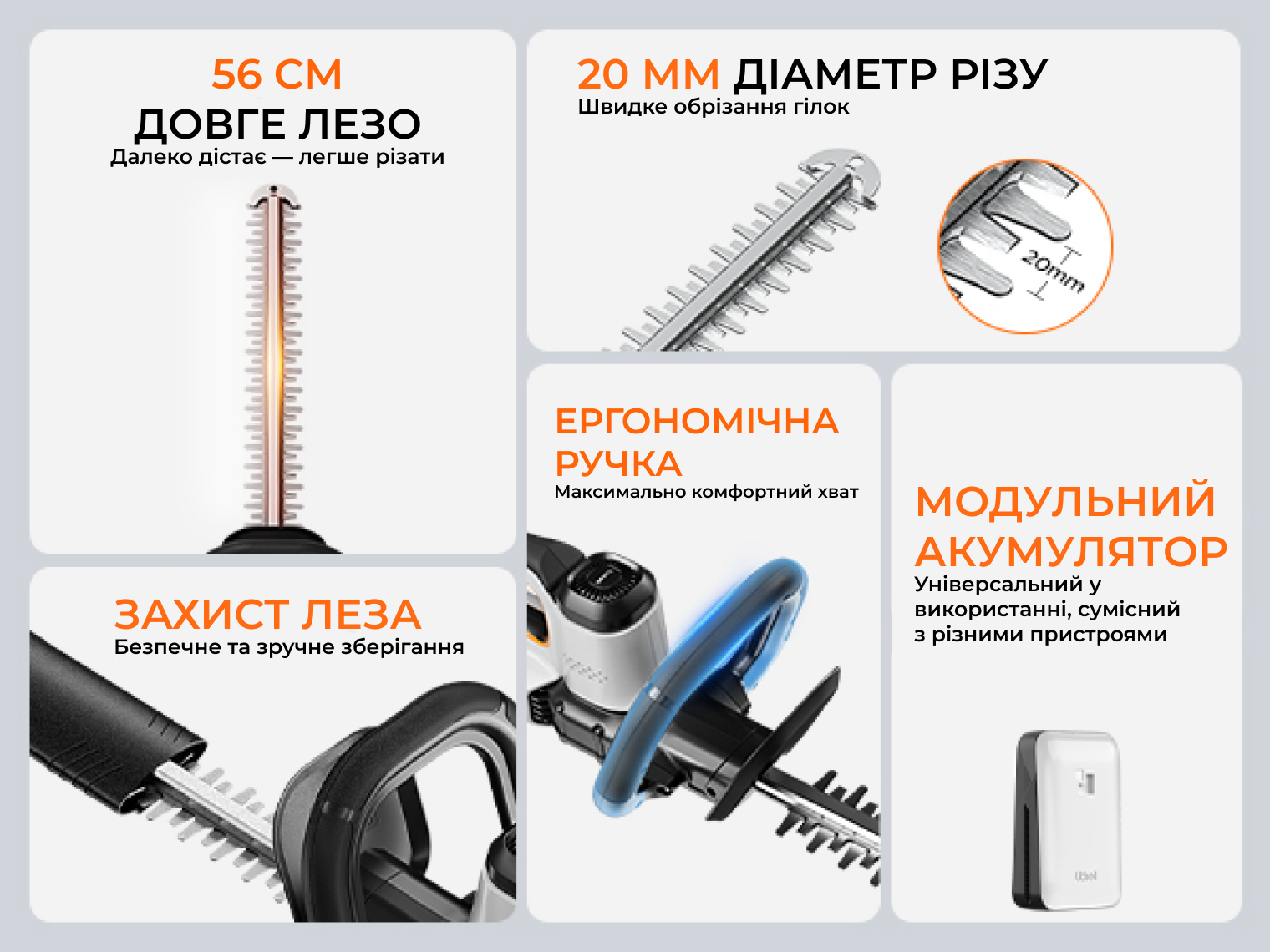 - акумуляторний кущоріз Litheli з живленням від УМБ 2.0 Ah;