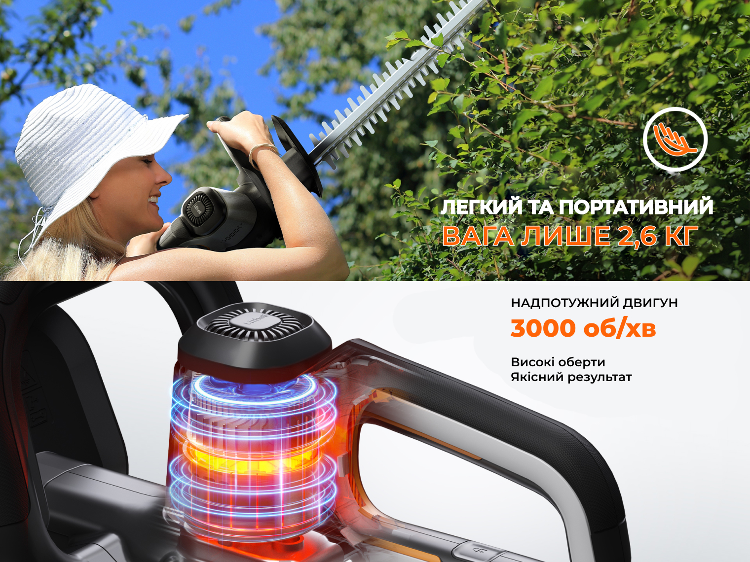- Безпека та повний контроль. Для запобігання випадкового запуску інструмент оснащений подвійним вимикачем — двигун запрацює лише при одночасному натисканні двох кнопок. Передній прозорий щиток надійно захищає ваші руки від дрібних трісок та листя, залишаючи робочу зону повністю відкритою для огляду.