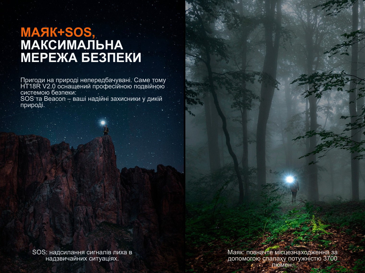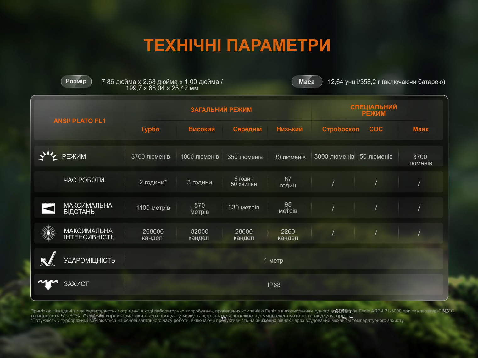 - Спалах: 3700 лм – 268000 кд – 2 год – 1100 м;