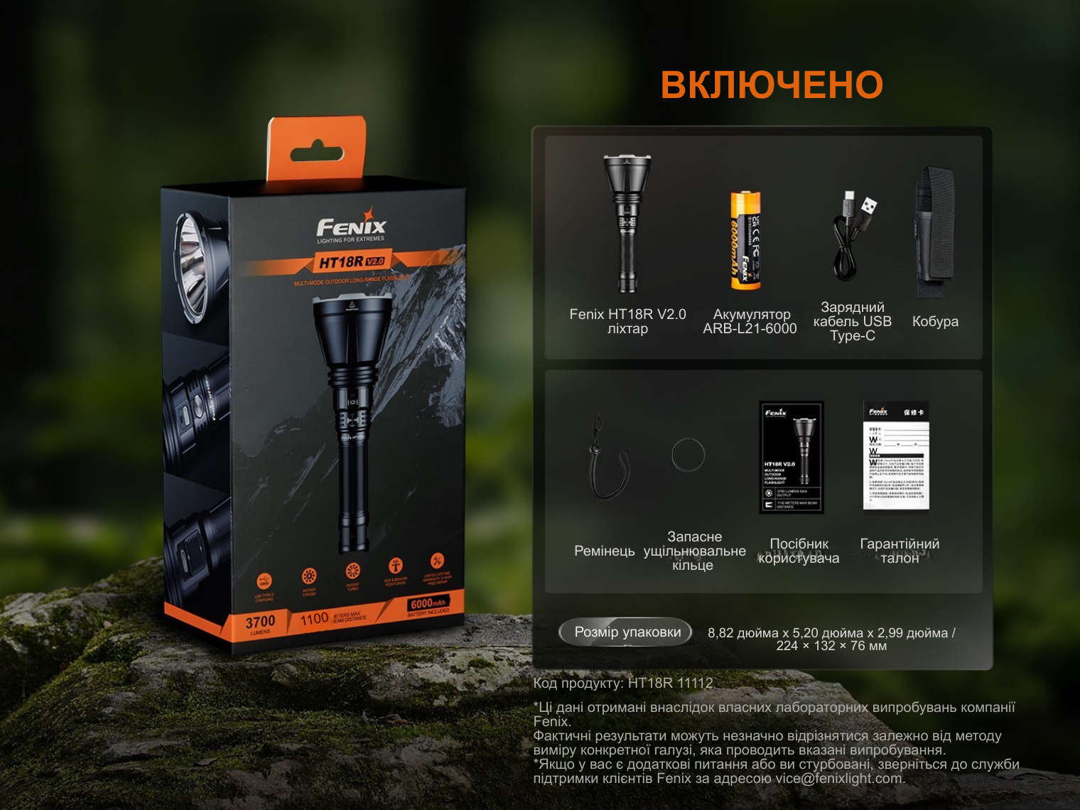Ліхтар Fenix HT18R v2.0, акумулятор ARB-L21-6000, зарядний кабель USB-C, темляк, чохол, запасне ущільнювальне кільце, інструкція користувача, гарантійний талон.