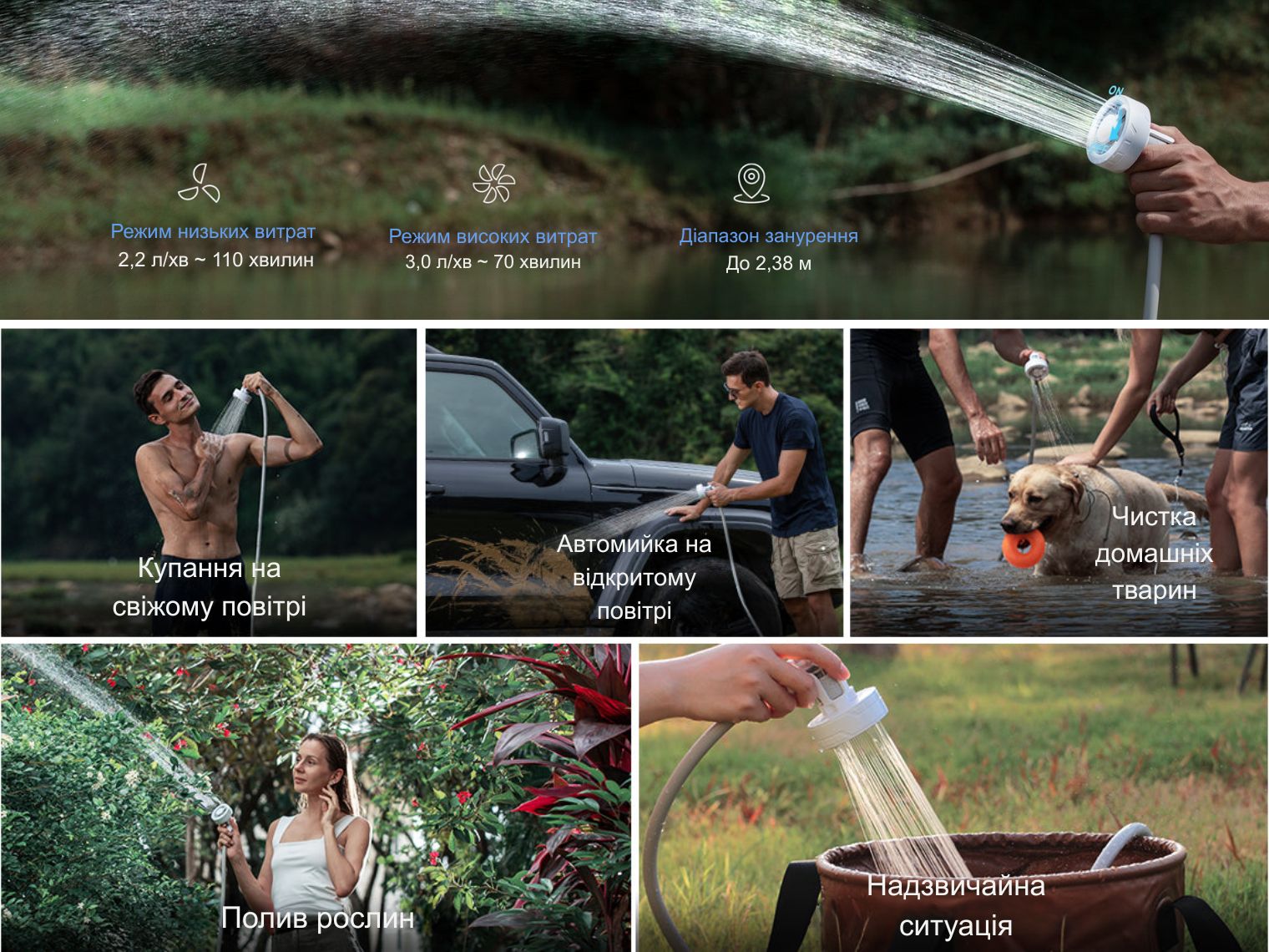 Опис душа портативного з насосом на акумуляторі Flextail Max Shower з чохлом, білого: