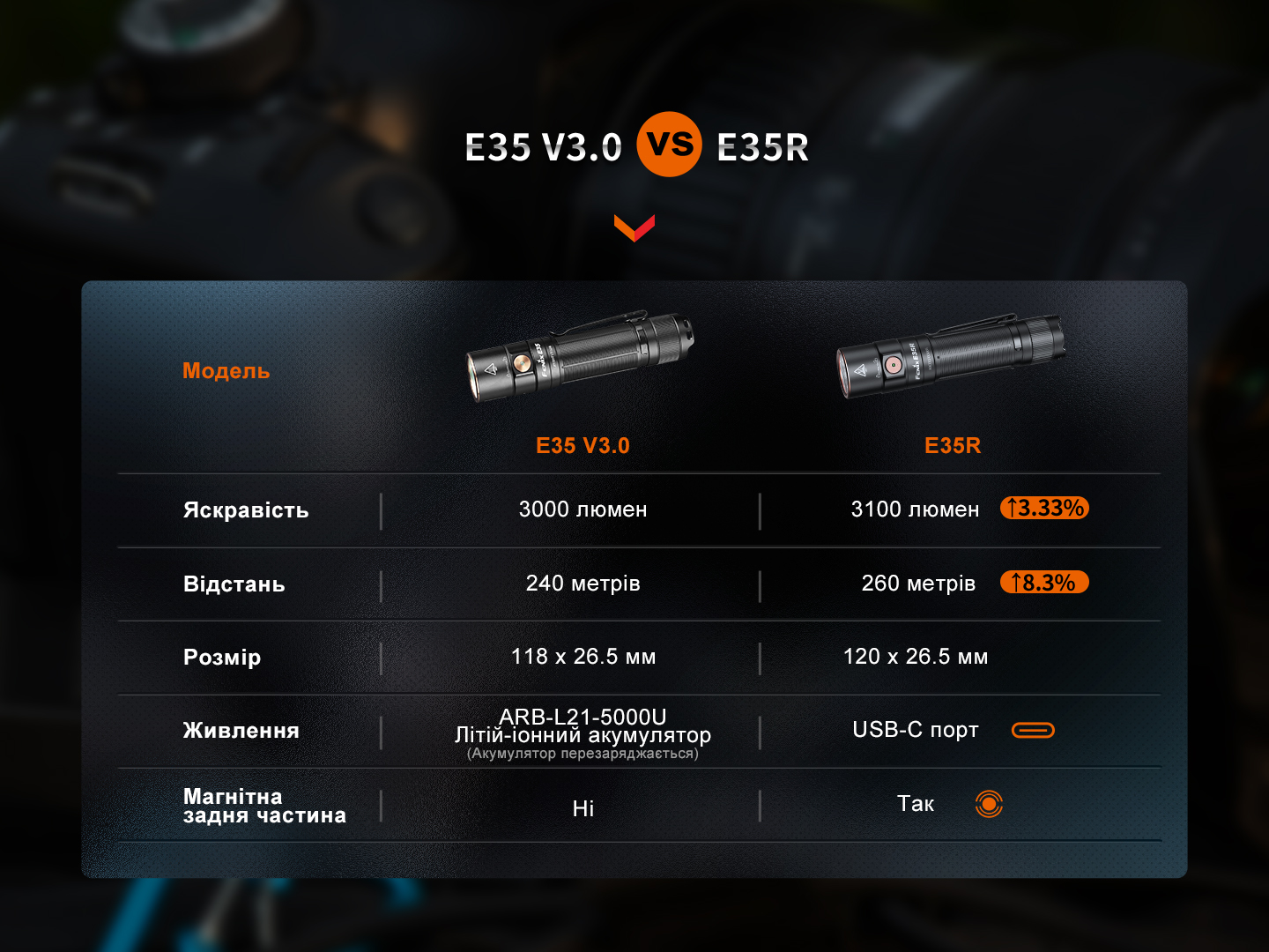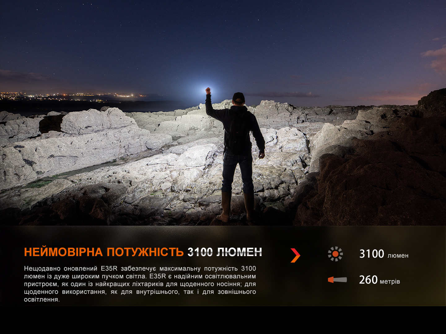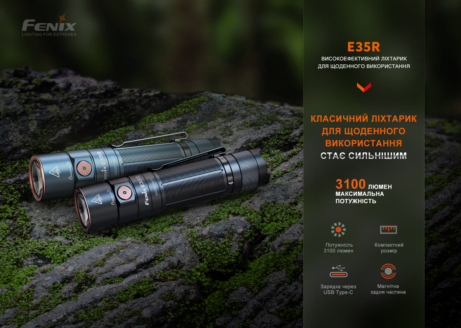 EDC-ліхтар Fenix E35R закриває всі завдання з освітлення у побуті та на просто неба: на риболовлі, у поїздках і професійних цілях. У порівнянні з попередньою версією E35 V3.0, ця модель отримала помітний приріст потужності променя: максимальний світловий потік тепер сягає 3100 люменів, а далекобійність — 260 м.