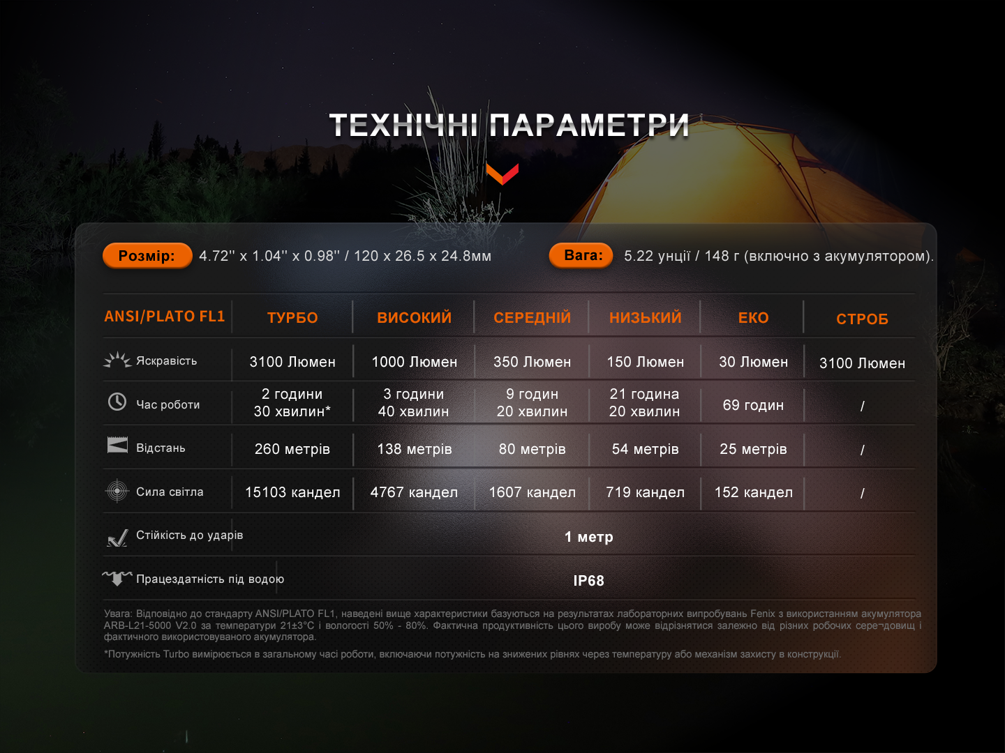 - Turbo: 3100 лм – 15103 кд – 260 м – 2 год 30 хв;