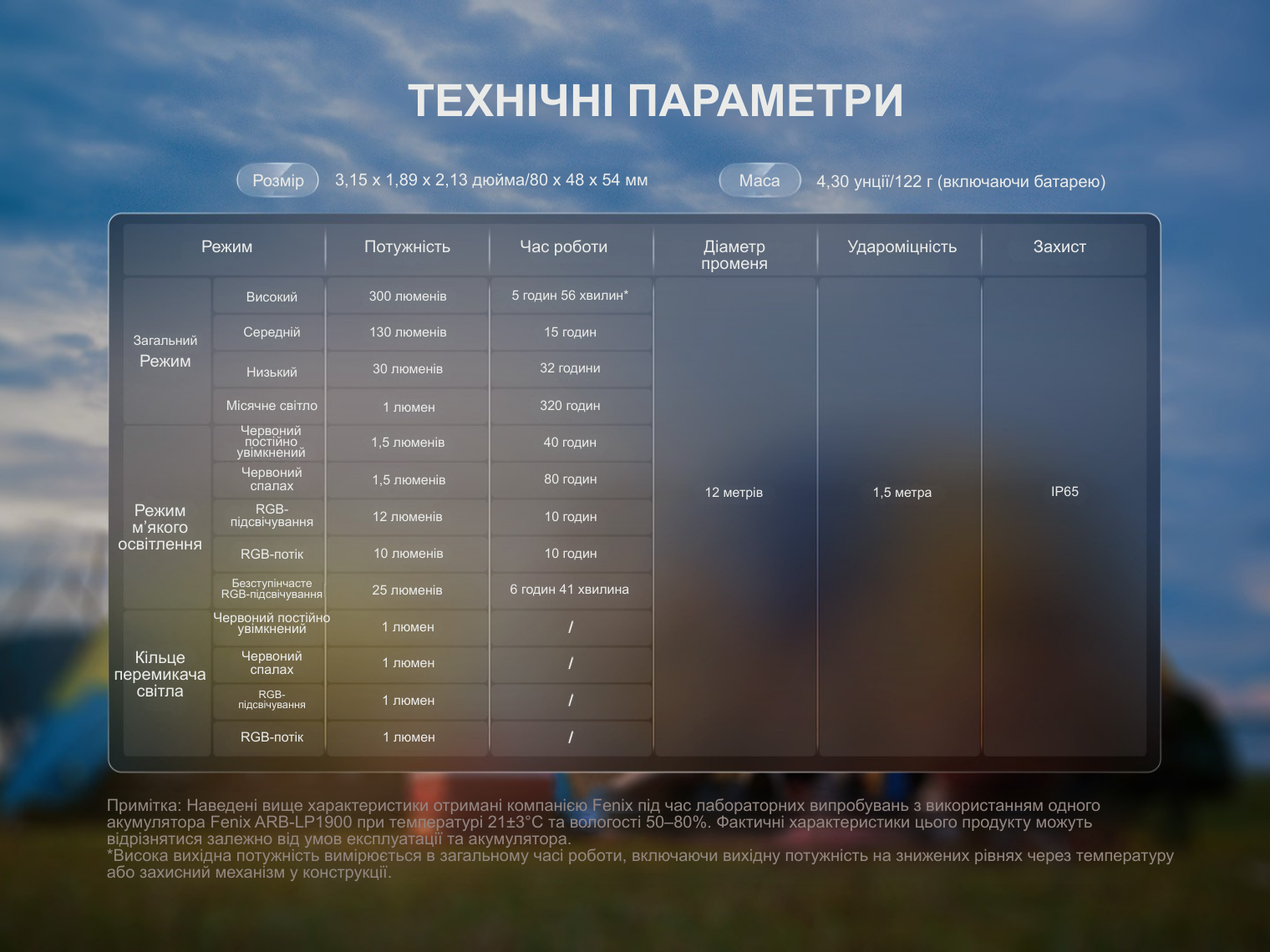 Зверніть увагу! Захист від перегріву автоматично спрацьовує у разі надмірного нагрівання електроніки всередині та знижує яскравість світла у режимі Високий. Час роботи у цьому режимі вказано з урахуванням зниження потужності.