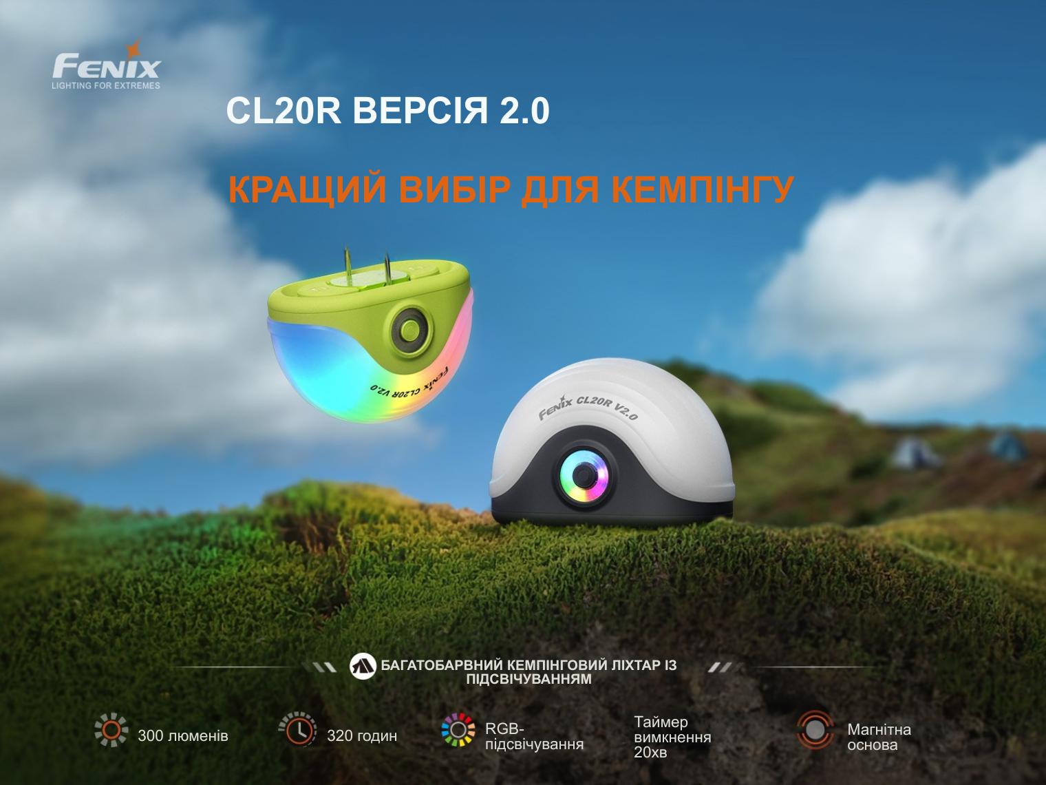 Fenix CL20R V2.0 — довгоочікуване оновлення ліхтаря-бестселера серед користувачів, котрі віддають перевагу функціональному кемпінговому освітленню. Модель дає рівномірне кругове світло, актуальне для польового табору, намету та ремонтних робіт, а також для домашнього підсвічування кімнати.