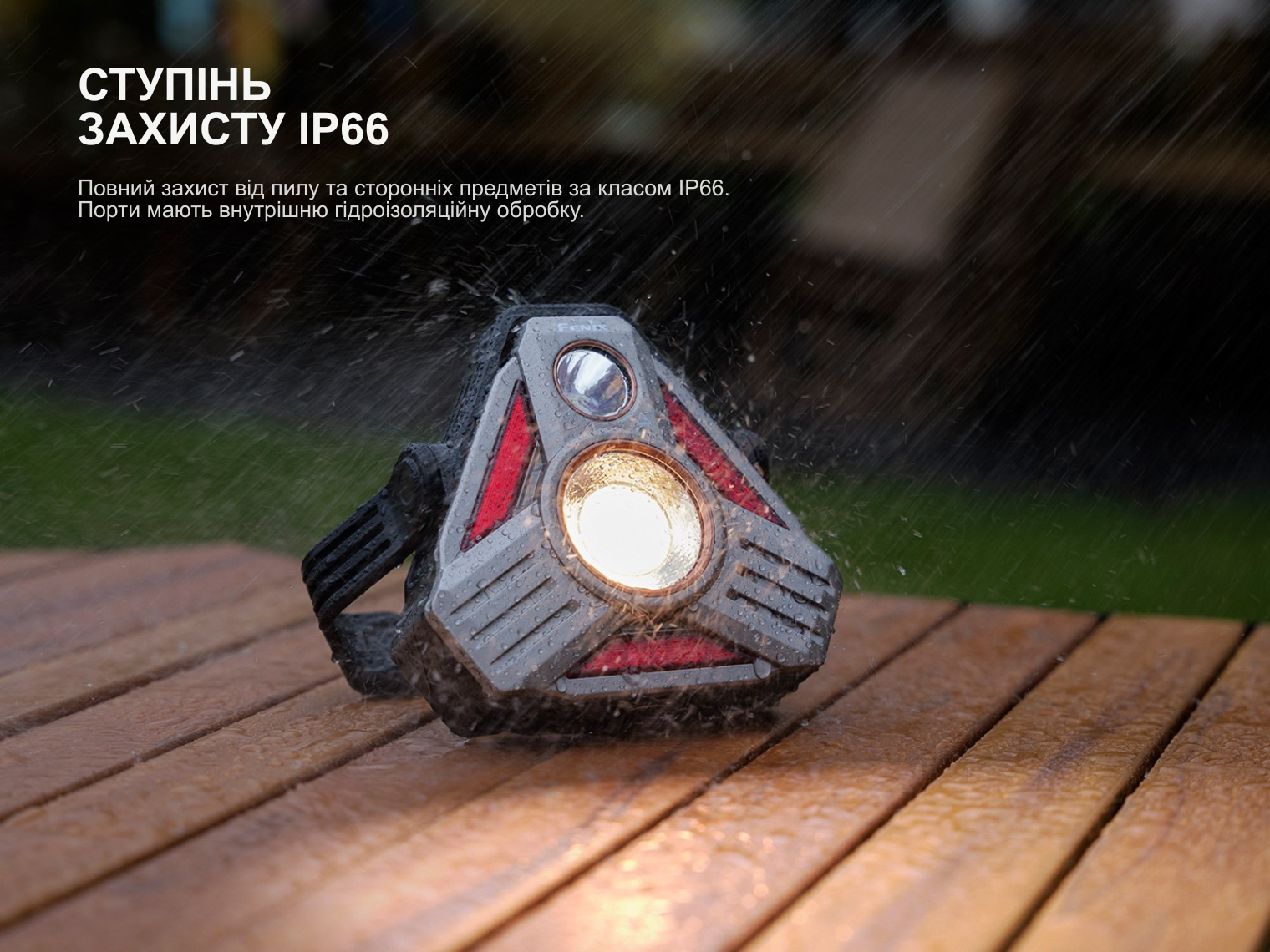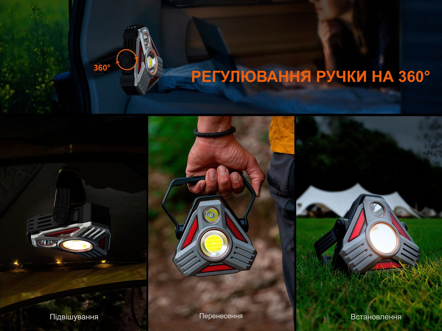 Fenix CP50R — це професійний ліхтар для кемпінгу, сервісних робіт та дорожніх служб, який пропонує розширений функціонал для професійних та повсякденних завдань. Унікальна трикутна форма корпусу нагадує попереджувальний знак, що робить модель незамінним помічником на небезпечних робочих майданчиках та на дорозі.