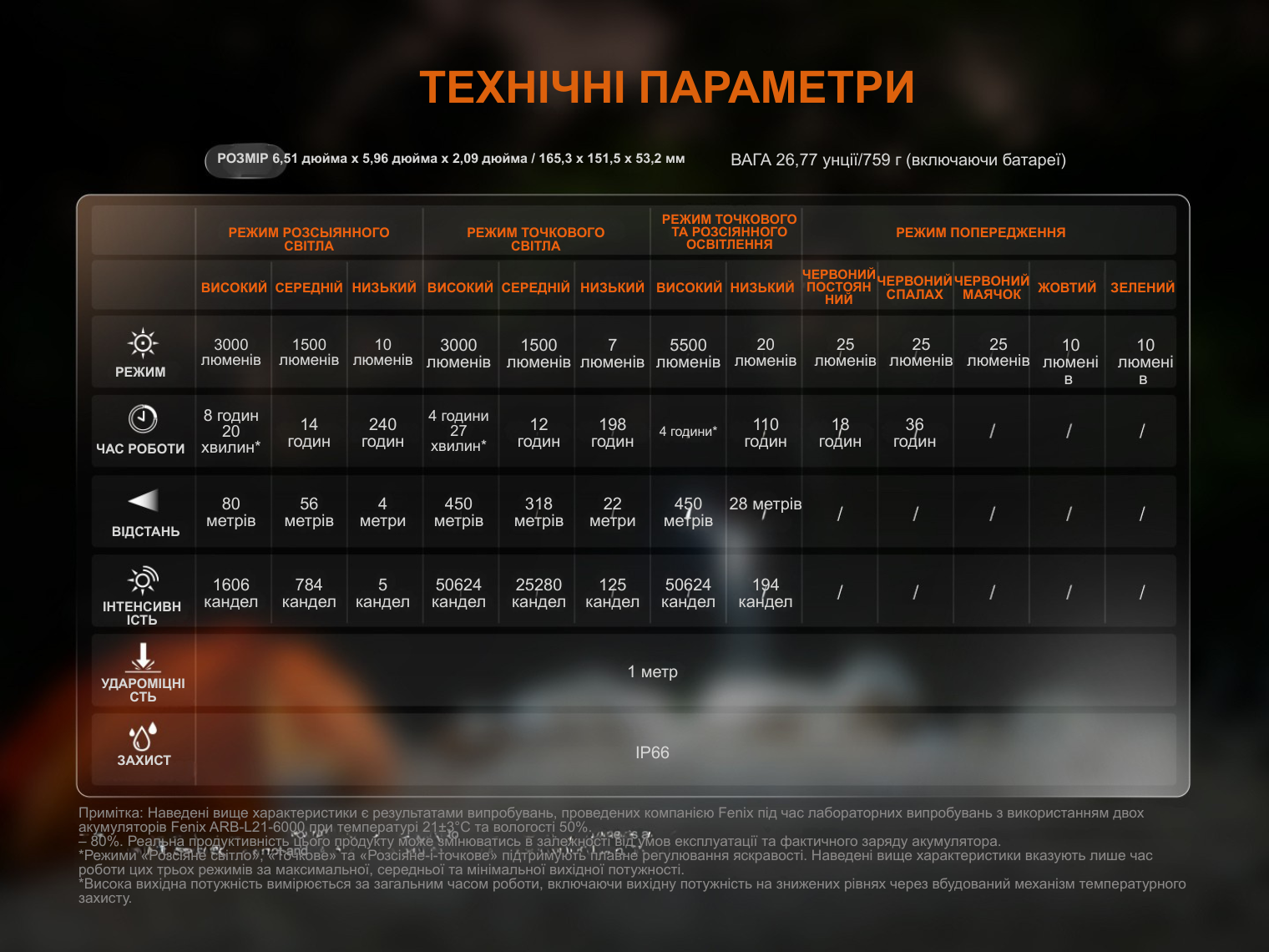 - Високий: 3000 лм – 1606 кд – 8 год 20 хв – 80 м;