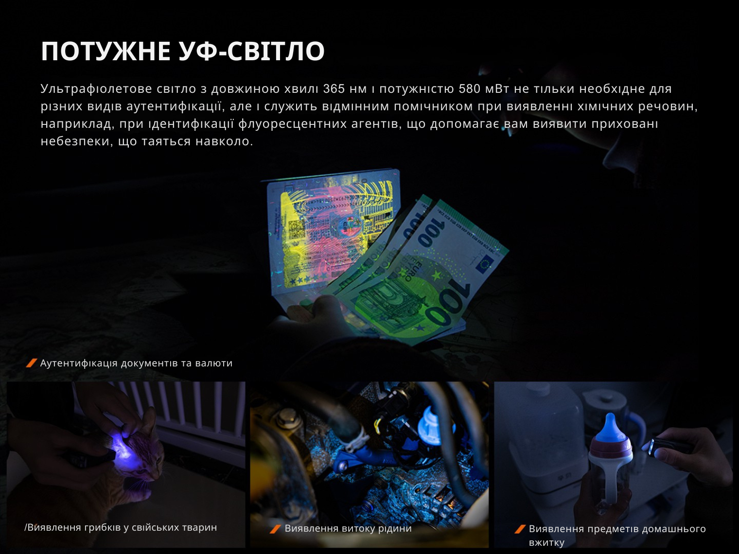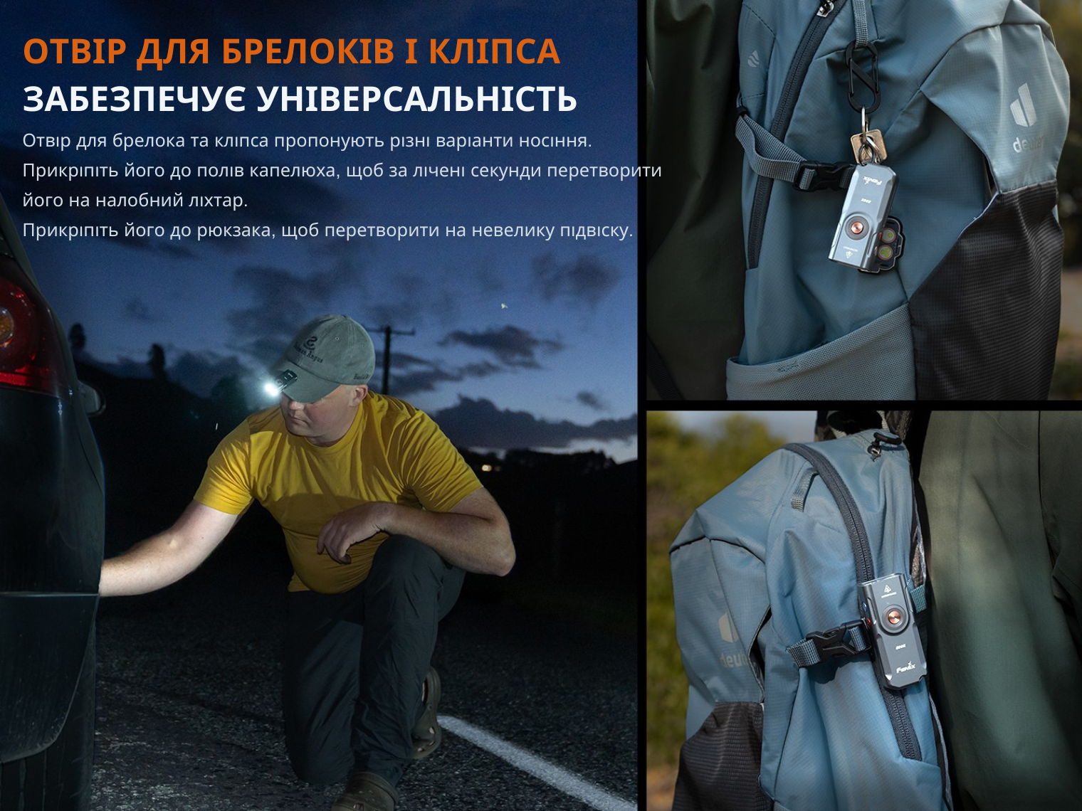 - ліхтар Fenix 3-в-1 з кишеньковим затискачем, металевим кільцем і вбудованим магнітом;