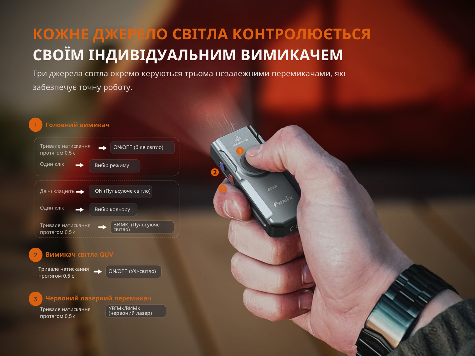 У E06R передбачено 10 режимів, згрупованих за типами світла. Кожна група керується своїм перемикачем: фронтальна кнопка відповідає за біле світло, а два бічних — за УФ та лазер відповідно.