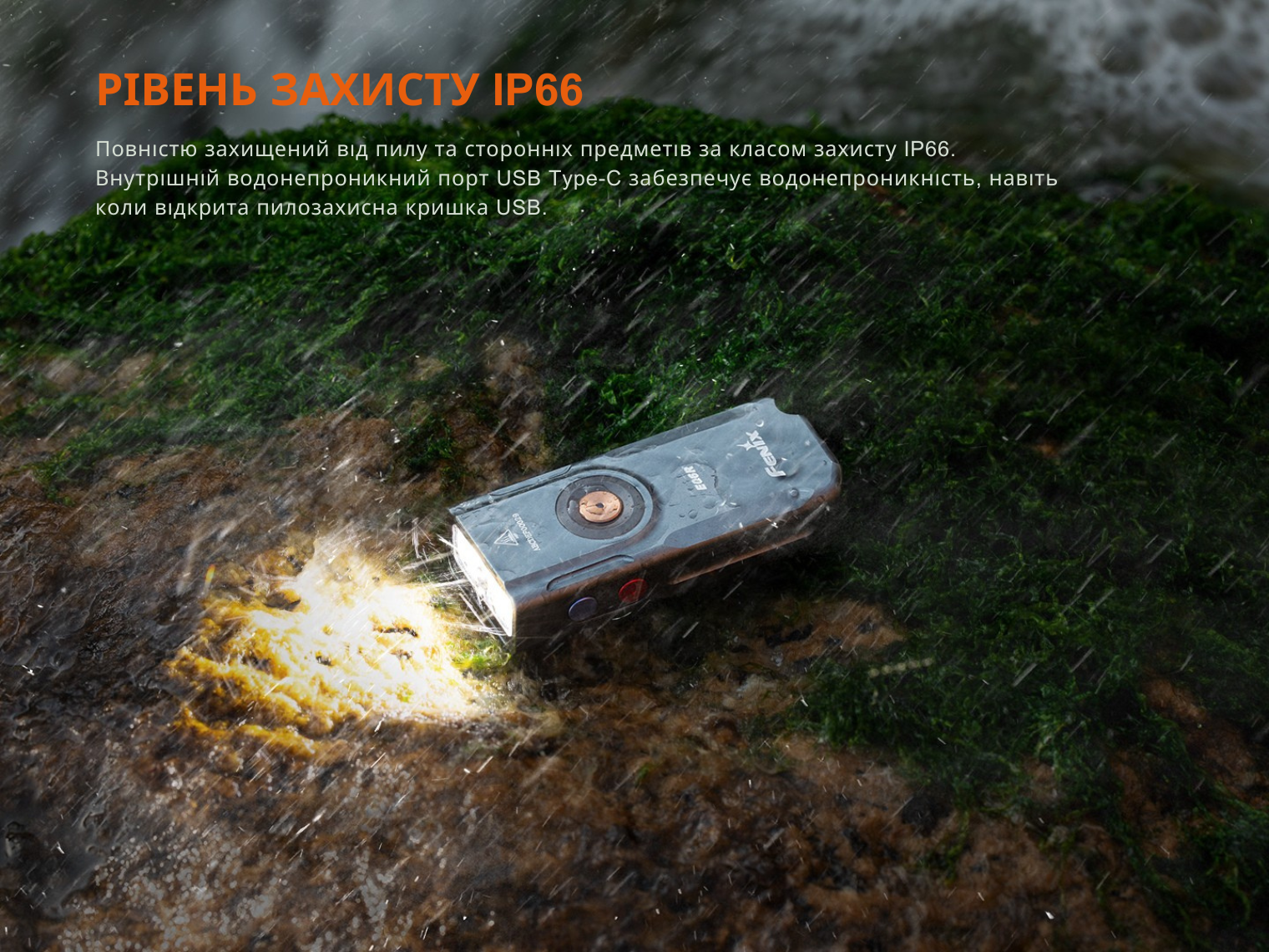 Суцільнометалевий корпус, оброблений на ЧПУ, має заокруглені грані для зручного хвату та захисне анодоване покриття проти корозії. Герметичність відповідає класу IP66, перешкоджаючи попаданню води та пилу всередину оболонки під час експлуатації у погану погоду. Вага ліхтаря становить лише 54 г.