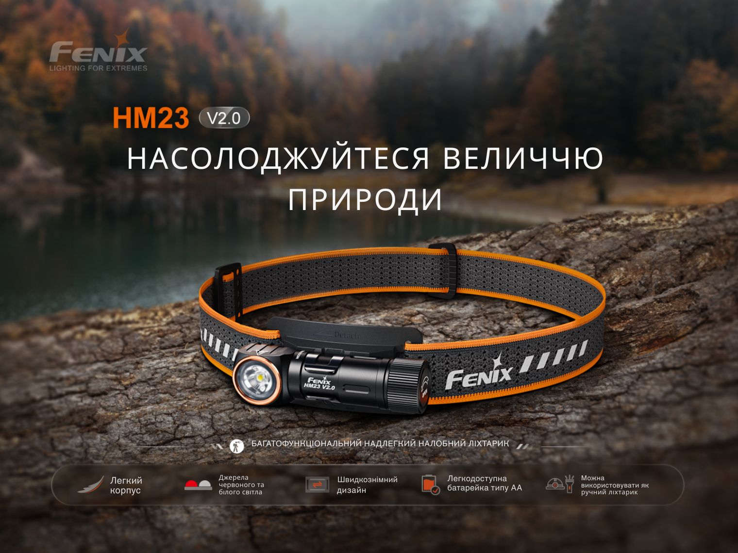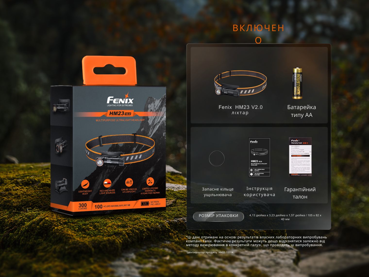Ліхтар Fenix HM23 V2.0 з налобною резинкою, батарея AA, запасне ущільнювальне кільце, інструкція користувача, гарантійний талон.
