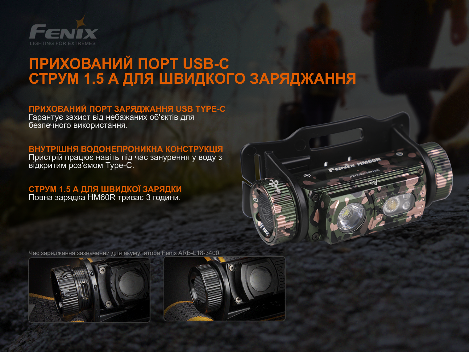 Ліхтар Fenix HM60R Camo, акумулятор ARB-L18-3400, кабель для зарядки USB Type-C, запасне ущільнювальне кільце, інструкція користувача, гарантійний талон.