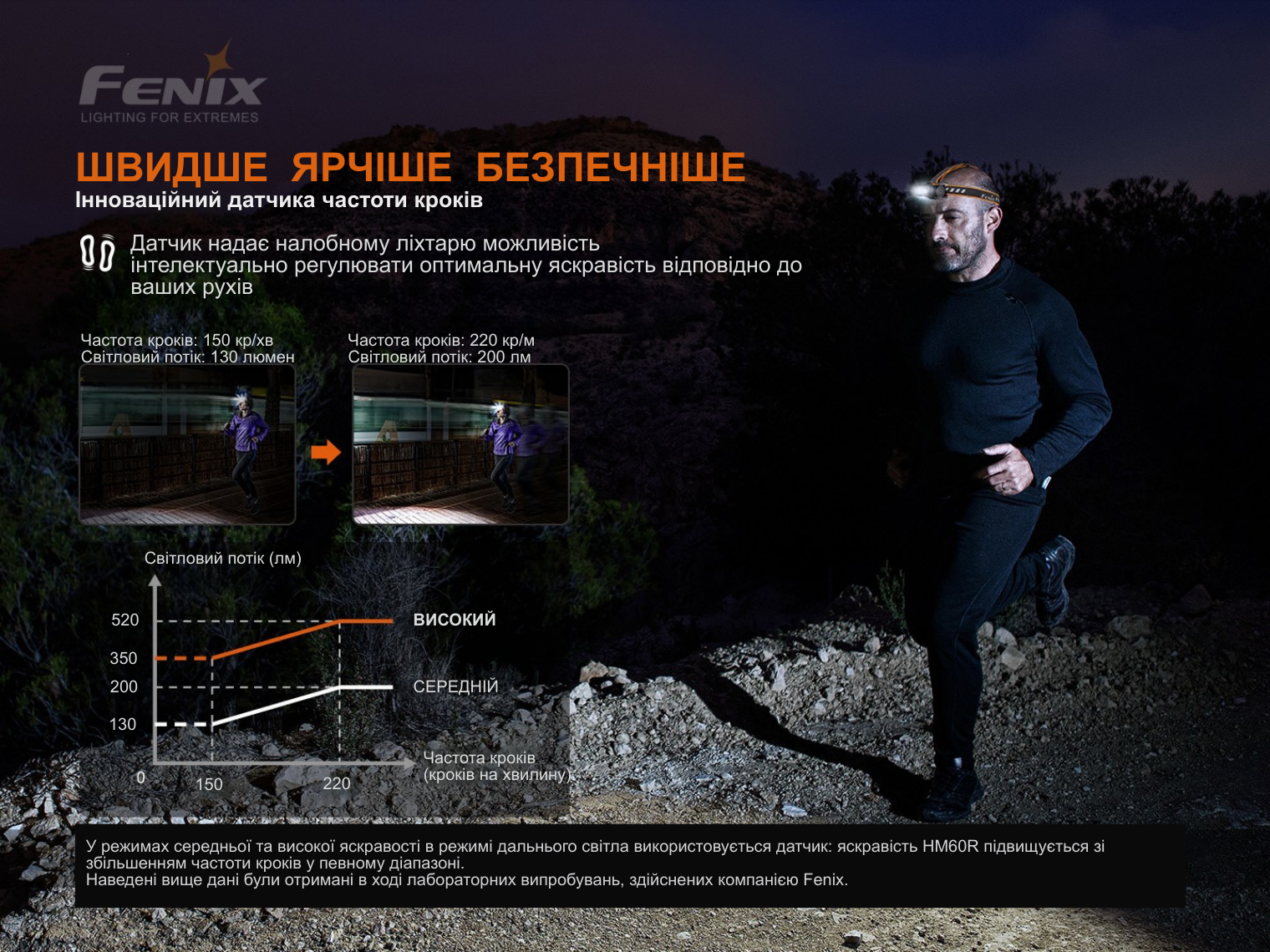 Унікальною фішкою моделі є інтелектуальний сенсор частоти кроку. Ліхтар автоматично регулює яскравість залежно від темпу вашого руху в «Середньому» та «Максимальному» режимах. За стандарт взято темп 150 кроків/хв: при прискоренні до 220 кр/хв яскравість зростає до 150%, а при уповільненні до 80 кр/хв — знижується до 70%. Якщо темп падає, яскравість зменшується поступово з затримкою в 10 секунд, що дозволяє очам адаптуватися до зміни світла.