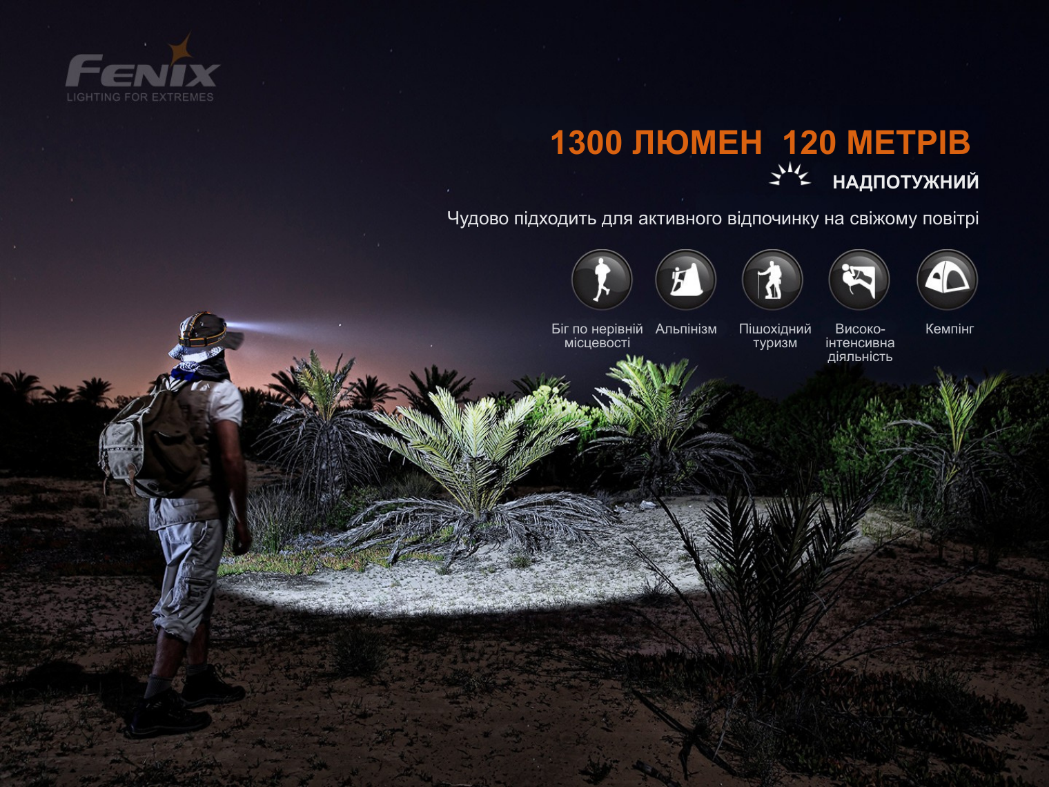 - Турбо: 1300 лм – 3400 кд – 2 год – 120 м;