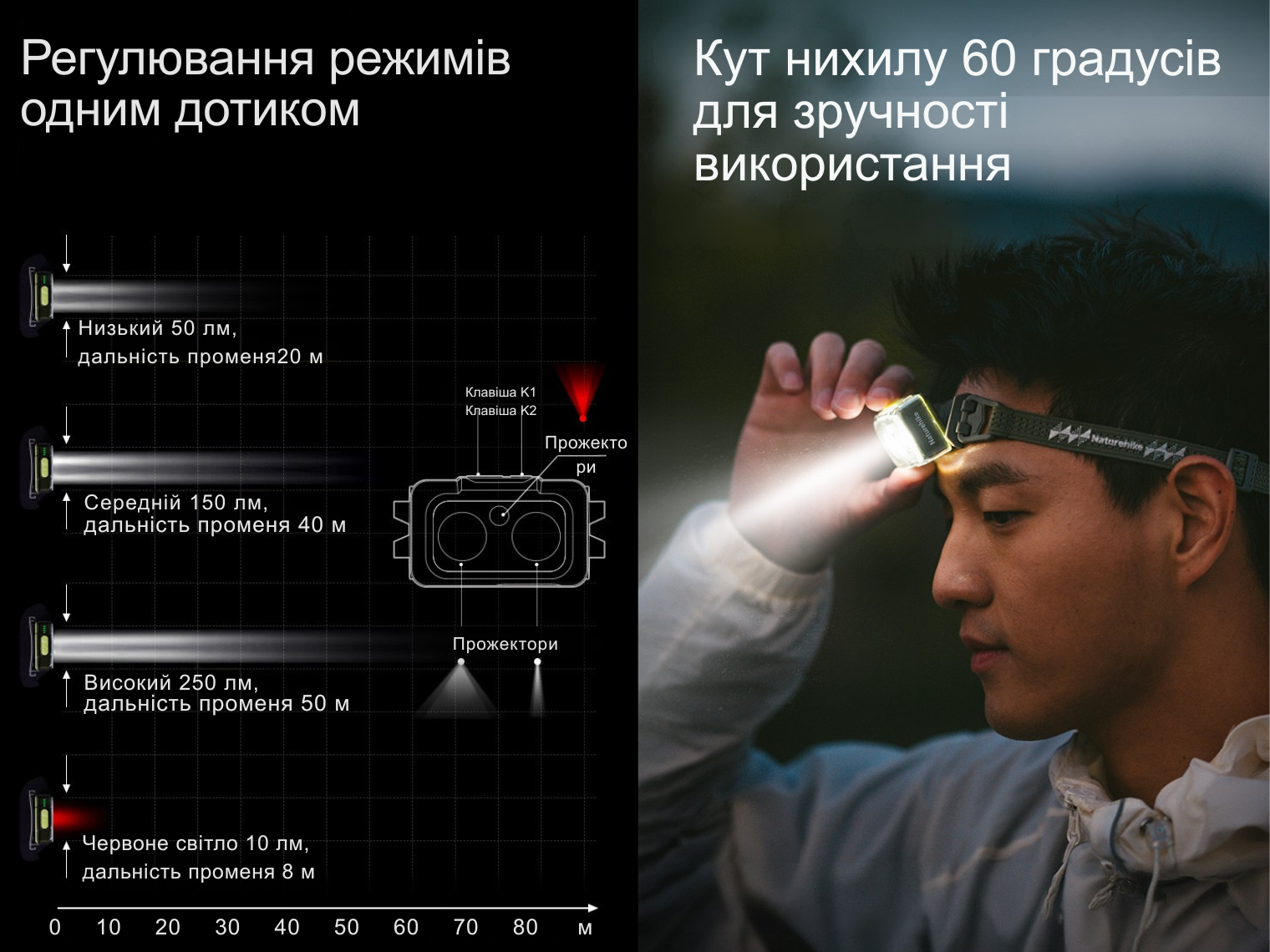 - Низький: 50 лм – 20 м – 8 год;