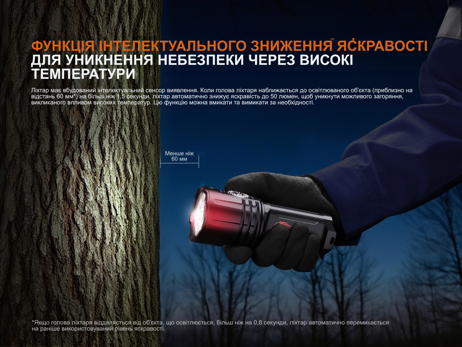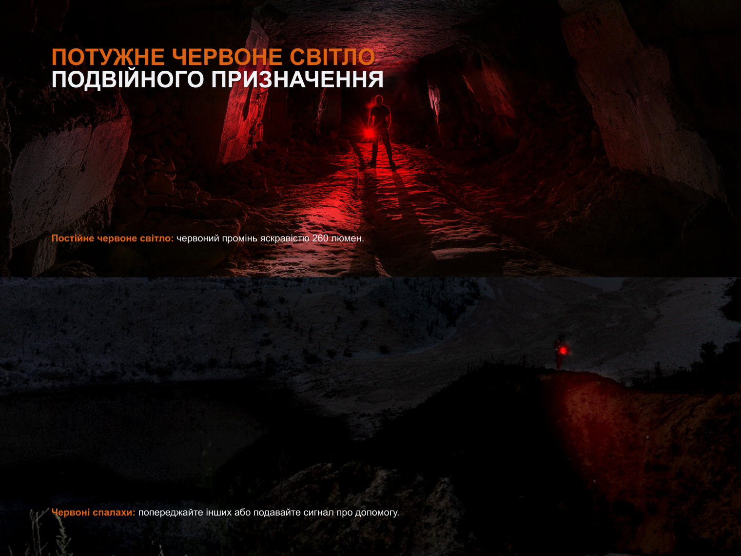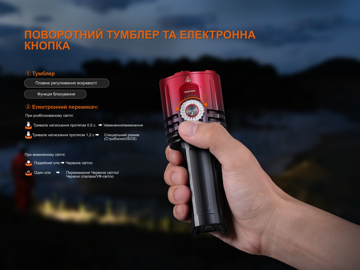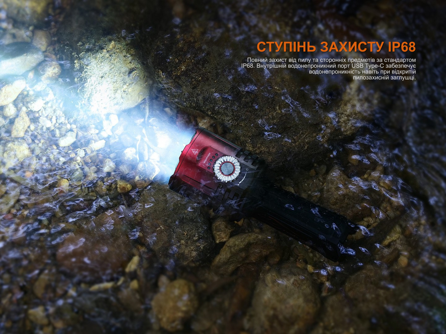 Це та сама легендарна модель LR35R PRO в лімітованому дизайні. Головною відмінністю став ексклюзивний колір корпусу. Глибокий градієнт переходить від вугільно-чорного до шляхетного винно-червоного і доповнений фірмовим принтом. Такий ліхтар підкреслює статус власника та стає справжньою колекційною річчю.