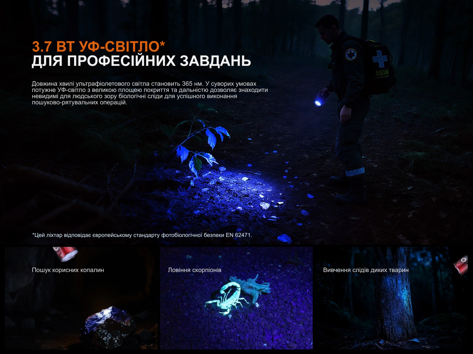 - Ультрафіолет. Потужний діод Luminus SST-10-UV працює в особливому діапазоні 365 нм — це невидиме оку світло, що проявляє приховані мітки на грошах і документах, сліди органіки чи дефекти на металі.