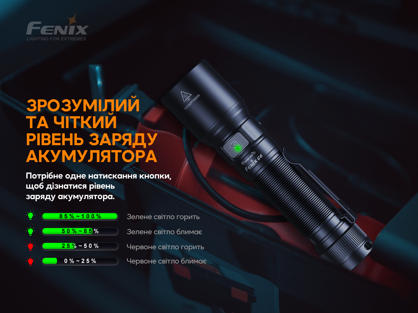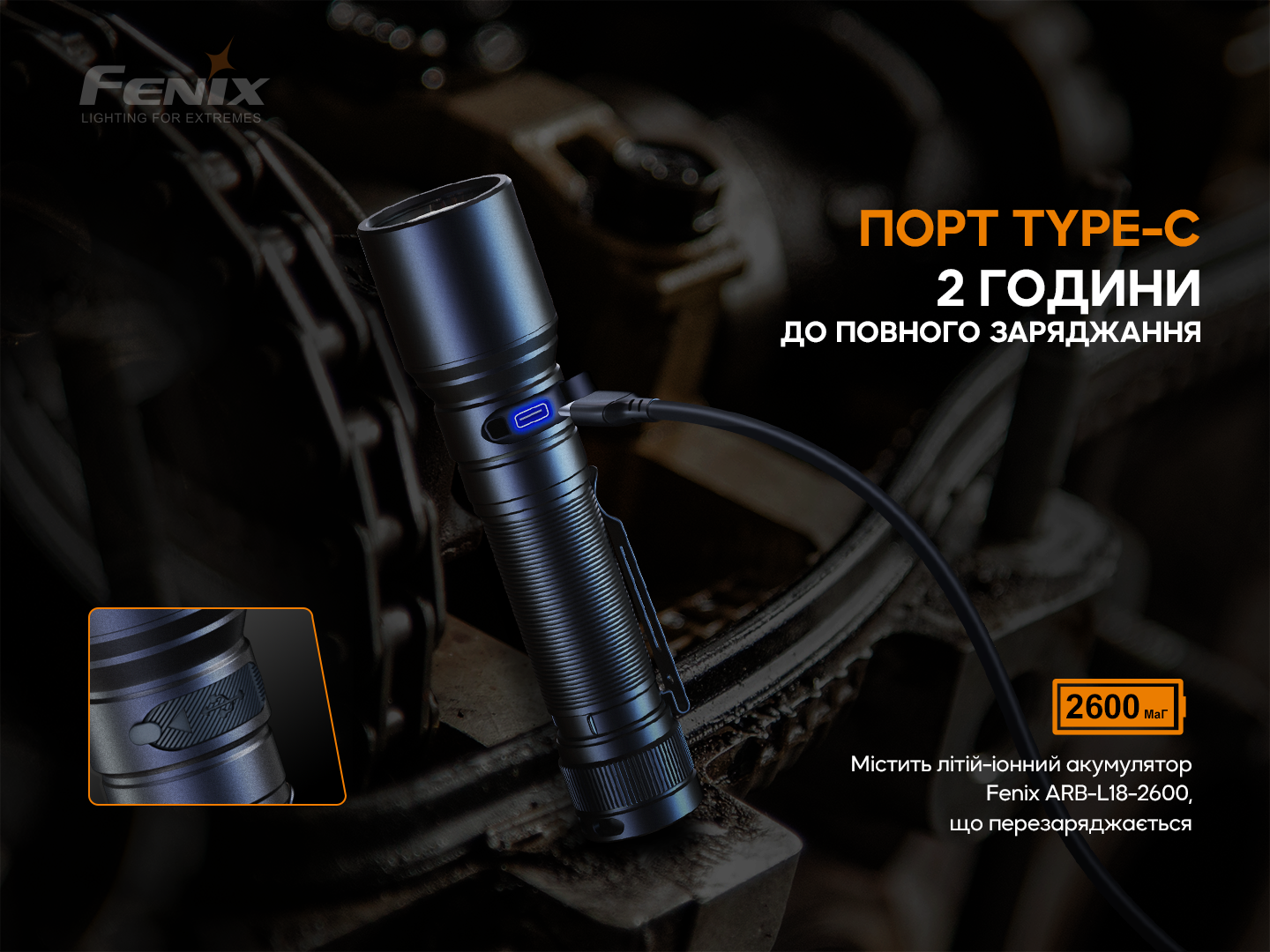 Для живлення підходить один акумулятор 18650 Fenix ARB-L18 (2600 мА·год), який заряджається у ліхтарі через порт USB-C. Повне заряджання триває приблизно 2 год при струмі до 2 А. Під час заряджання вам доступний для використання режим Low, що зручно для «чергового» підсвічування.