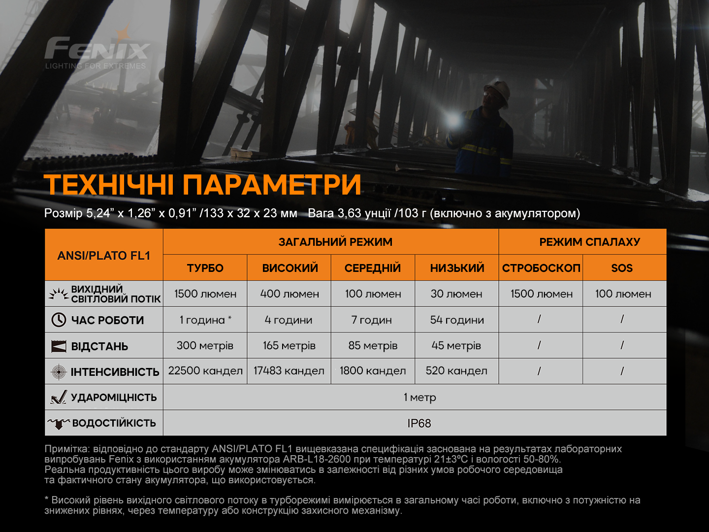 - Turbo: 1500 лм – 22500 кд – 1 год – 300 м;