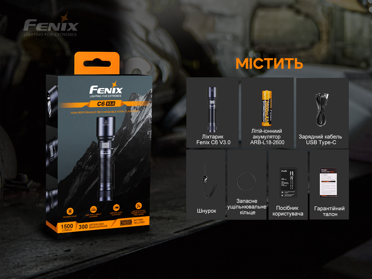 Ліхтар Fenix C6V3.0, акумулятор ARB-L18-2600, кабель USB-C для заряджання, темляк, запасне ущільнювальне кільце, інструкція, гарантійний талон.