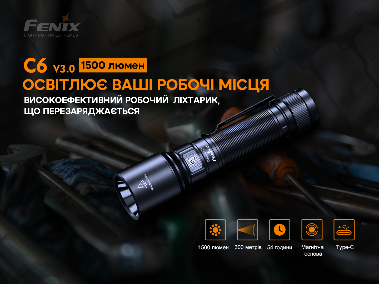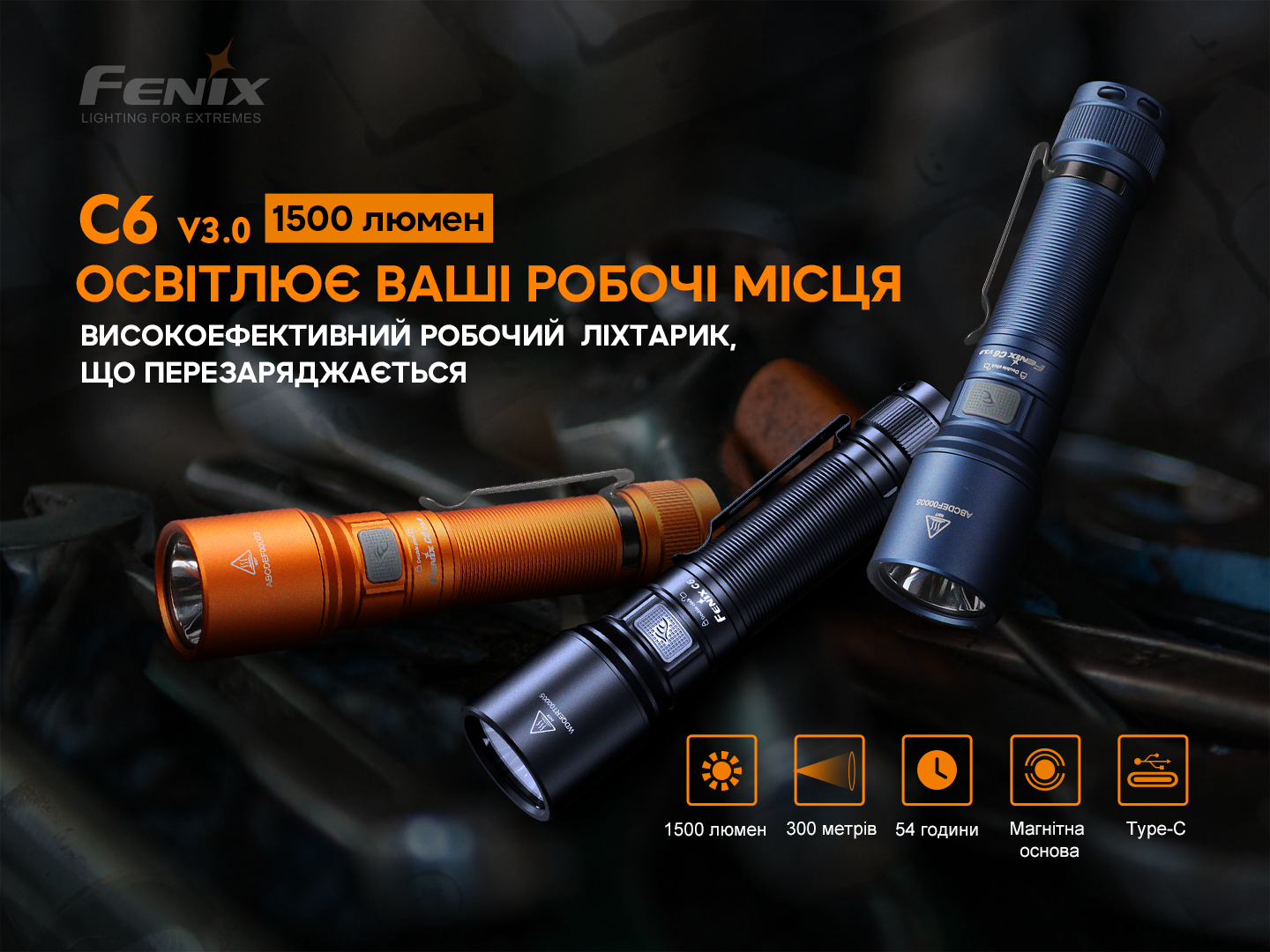 Ручний ліхтар Fenix C6 V3.0 оснащений холодним білим світлодіодом Luminus SST40, який генерує промінь потужністю до 1500 лм та дальністю 300 м. Модель актуальна для професійних цілей, будівництва, активного відпочинку та повсякденних завдань у побуті, коли потрібне яскраве спрямоване світло, швидке заряджання, а в деяких випадках потрібно повністю звільнити руки для виконання специфічних робіт. Для цього в конструкцію вбудовано магніт для фіксації на металі.