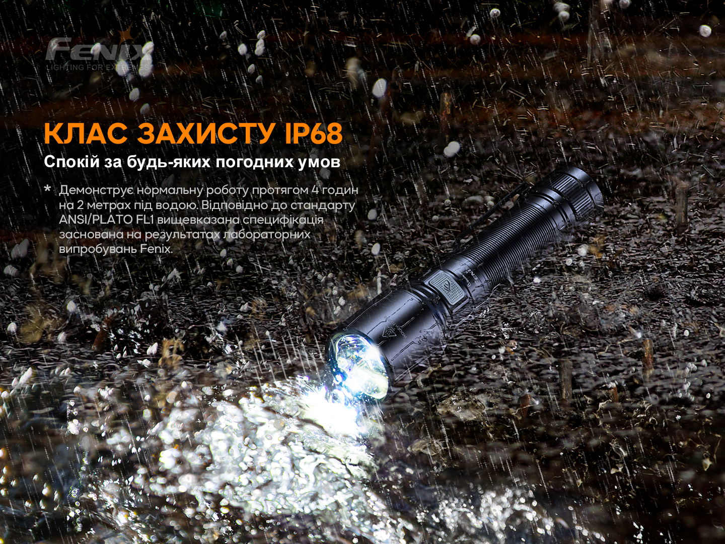 Клас герметичності ліхтаря досягає IP68 (максимальний рівень). Удароміцність 1 м запобігає ламанню в ситуації випадкових падінь з висоти.