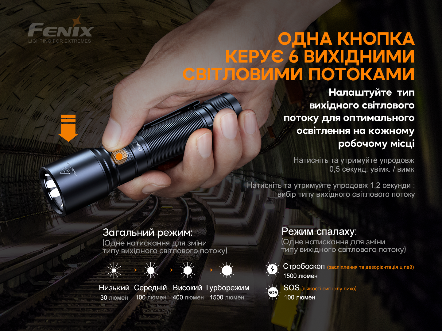 Інтерфейс Fenix C6V3.0 складається з 6 режимів: 4 з постійним світлом і кілька миготливих для екстрених випадків: