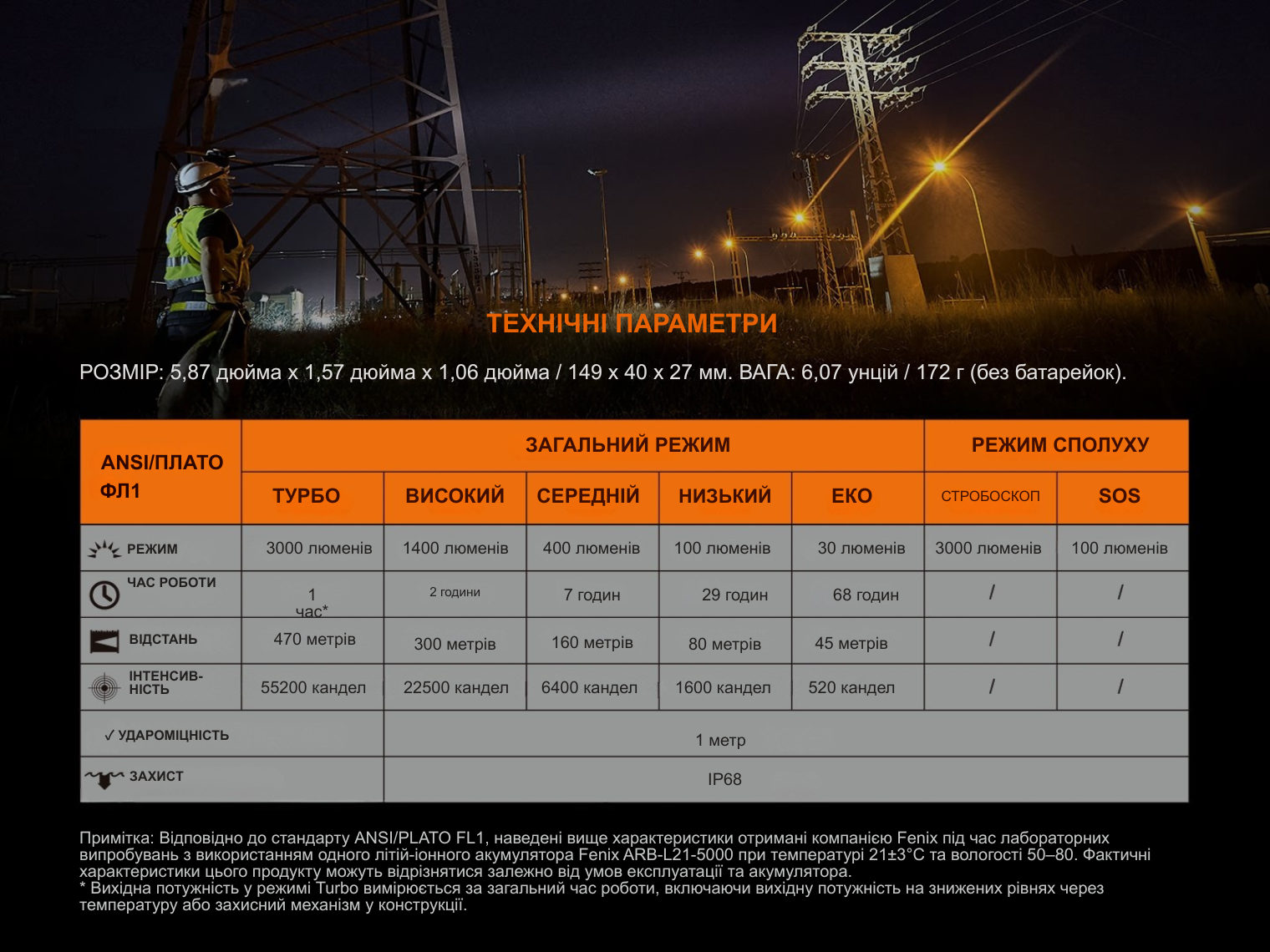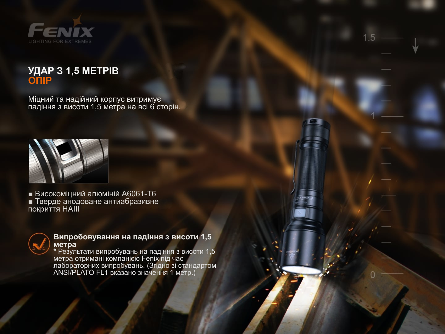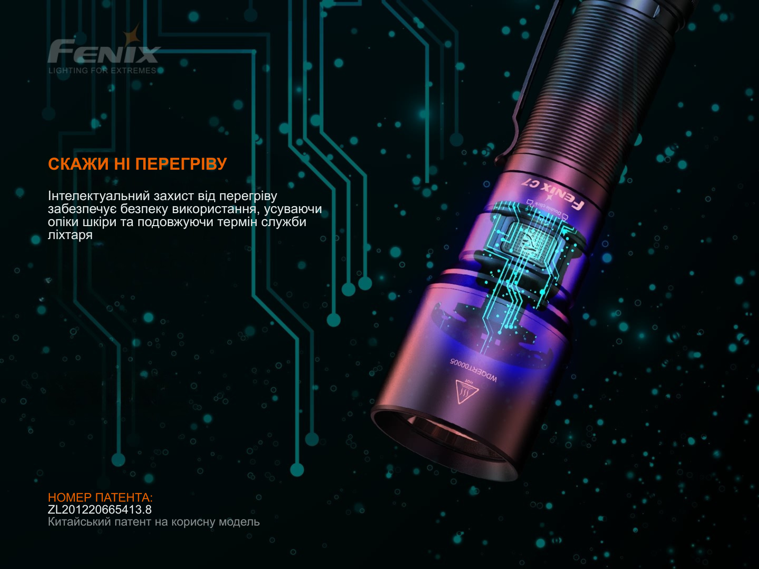 Комплектація | Fenix C7, аккумулятор ARB-L21-5000 (21700), зарядный кабель USB Type-C, темляк, запасное уплотнительное кольцо, руководство пользователя |