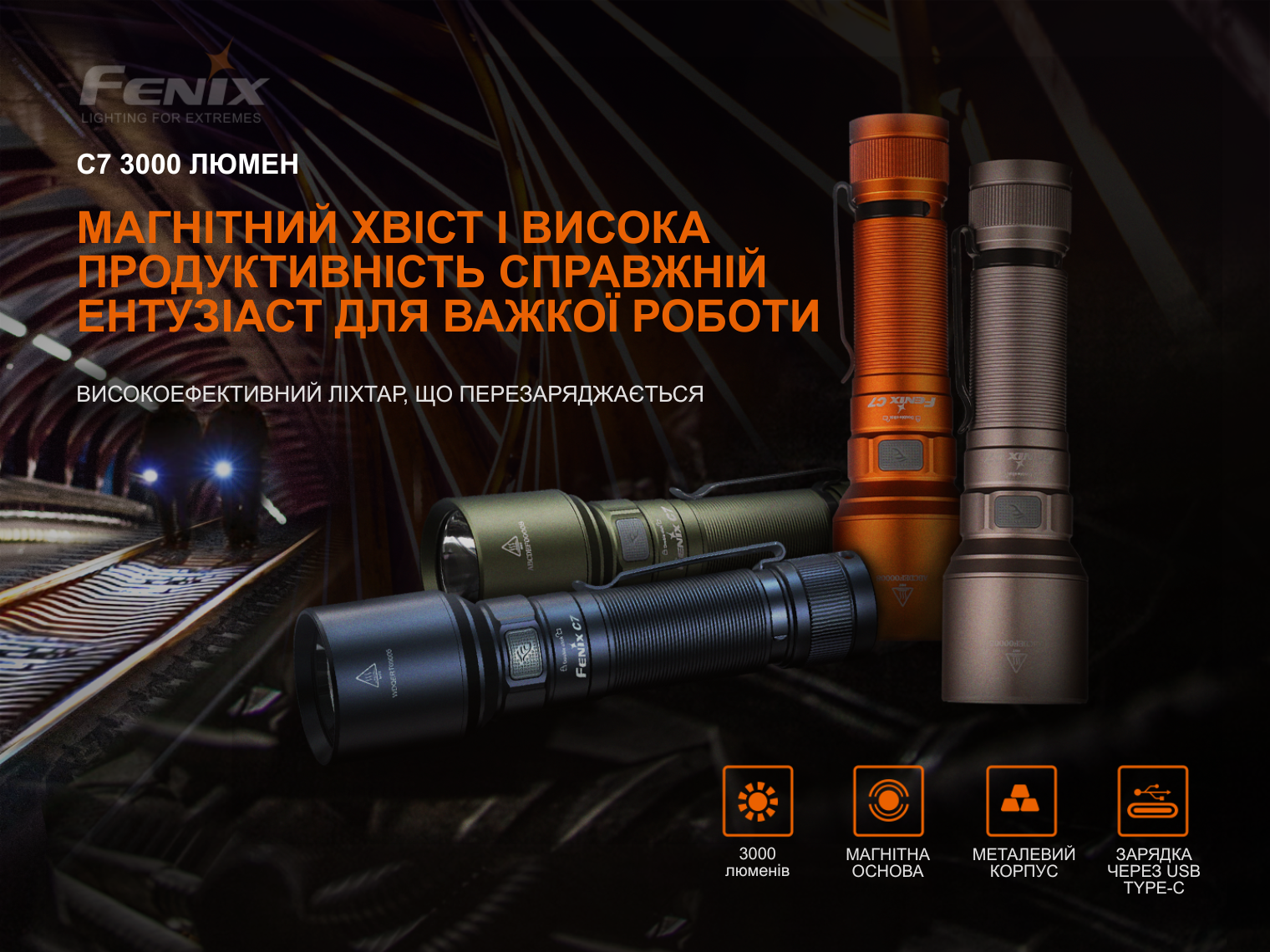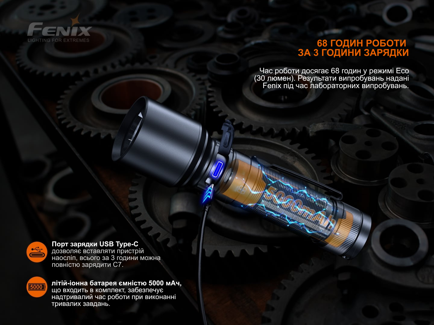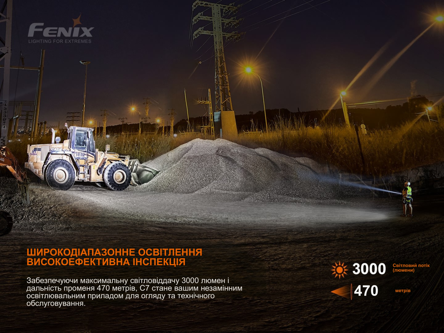 Перезаряджуваний ручний ліхтар Fenix C7 розрахований на побутове застосування та на професійні завдання, де потрібне потужне та автономне джерело світла. В основі — білий світлодіод Luminus SST70 з піковою яскравістю 3000 лм та дальністю променя до 470 м. Ресурс світлодіода сягає 50 000 годин.