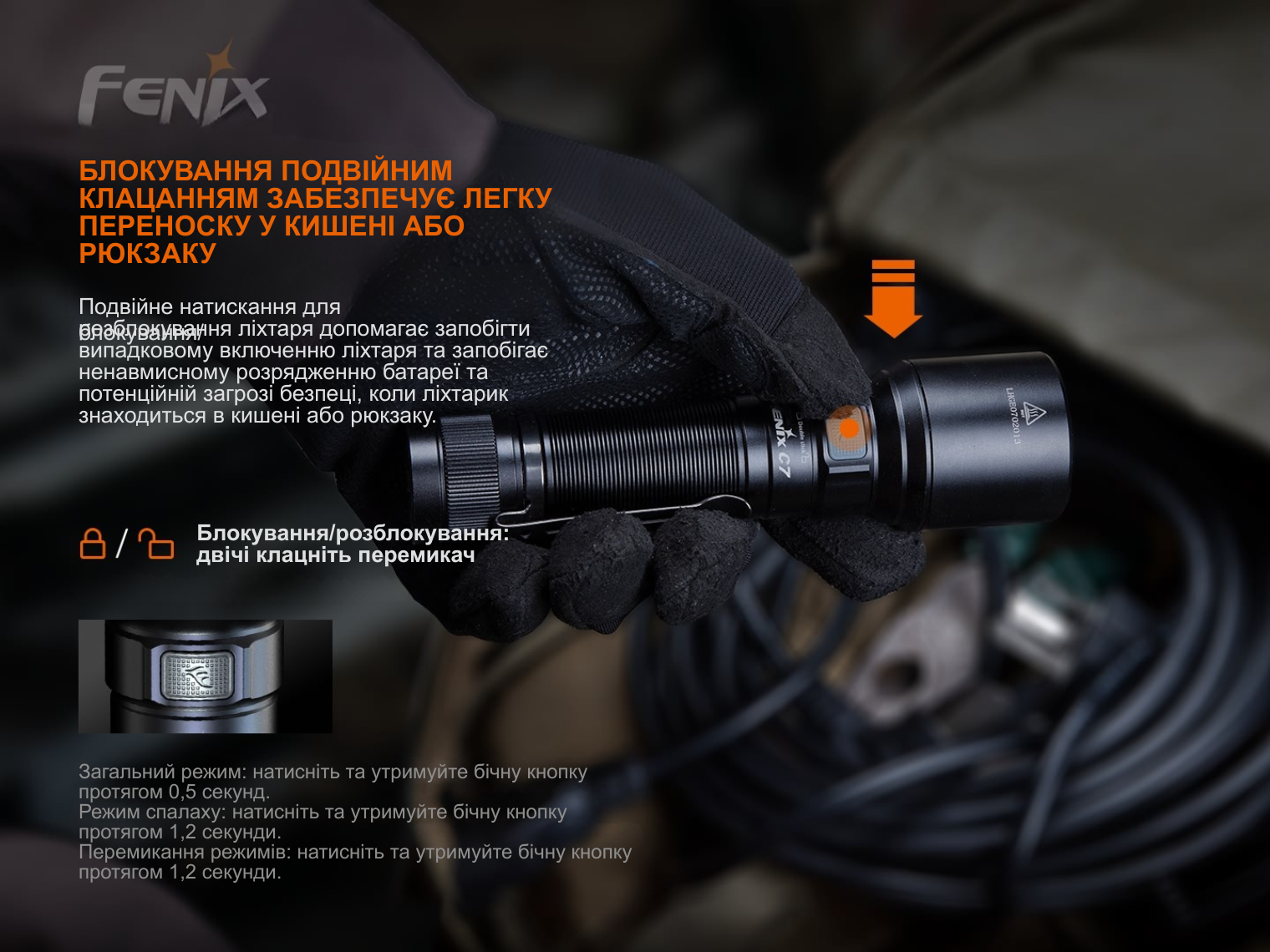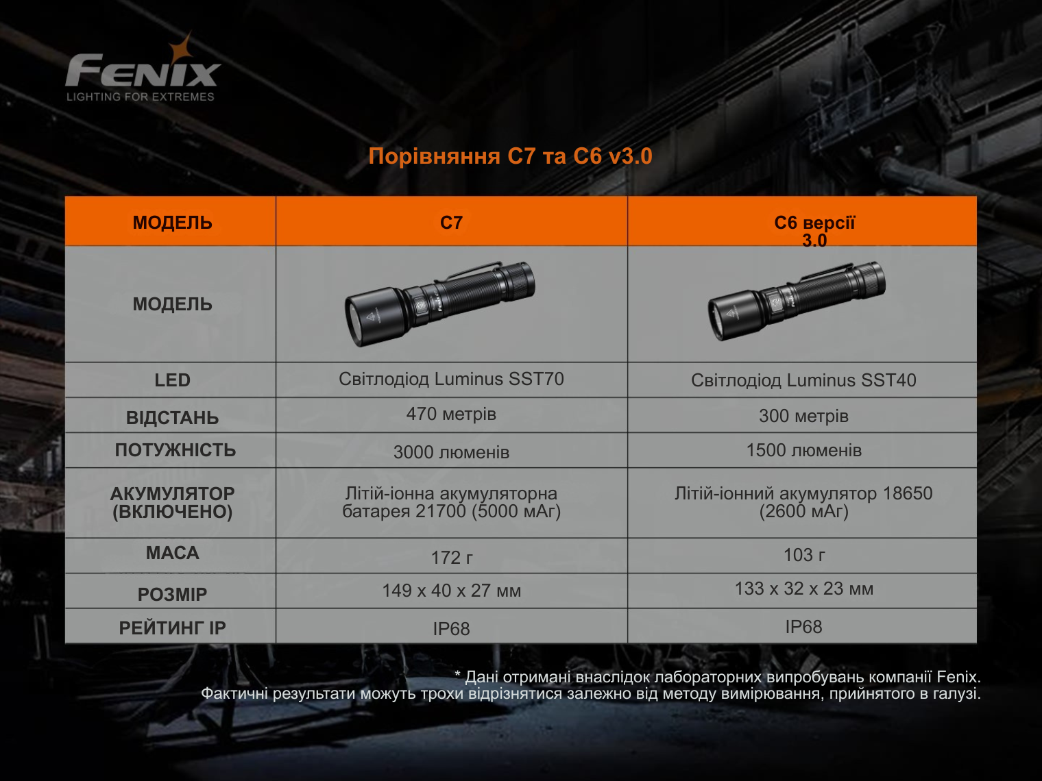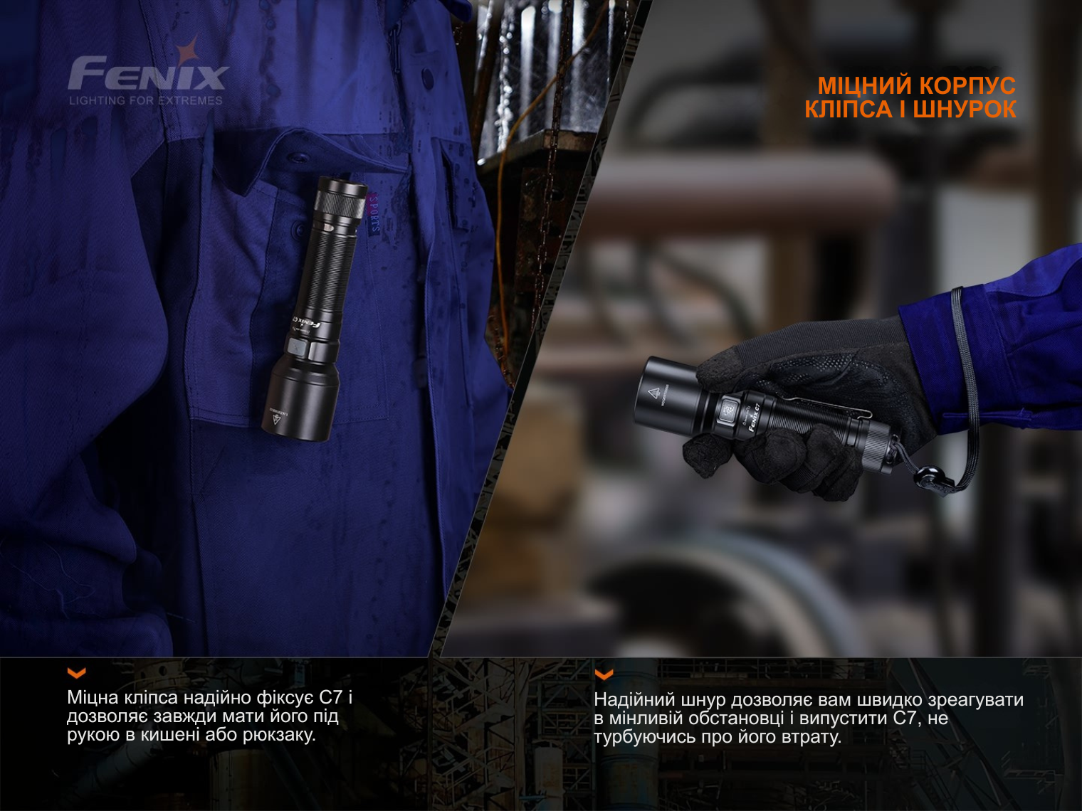 Перезаряджуваний ручний ліхтар Fenix C7 розрахований на побутове застосування та на професійні завдання, де потрібне потужне та автономне джерело світла. В основі — білий світлодіод Luminus SST70 з піковою яскравістю 3000 лм та дальністю променя до 470 м. Ресурс світлодіода сягає 50 000 годин.