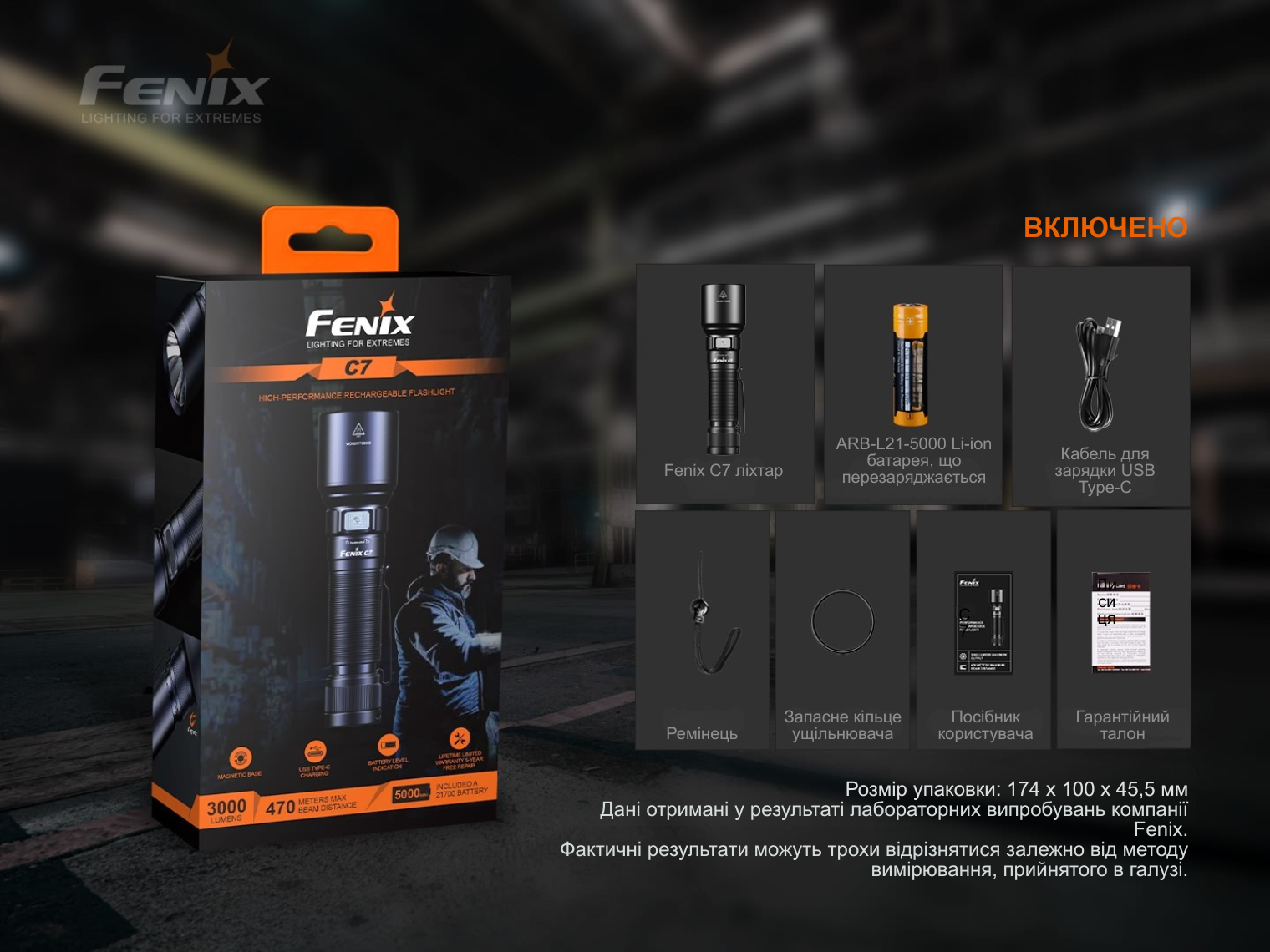 Ліхтар Fenix C7, акумулятор ARB-L21-5000 (21700), зарядний кабель USB Type-C, темляк, запасне ущільнювальне кільце, посібник користувача та гарантія.