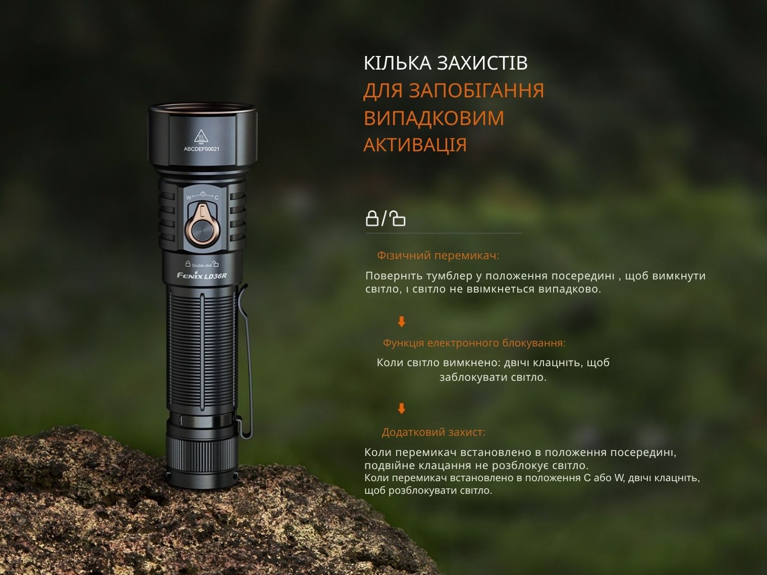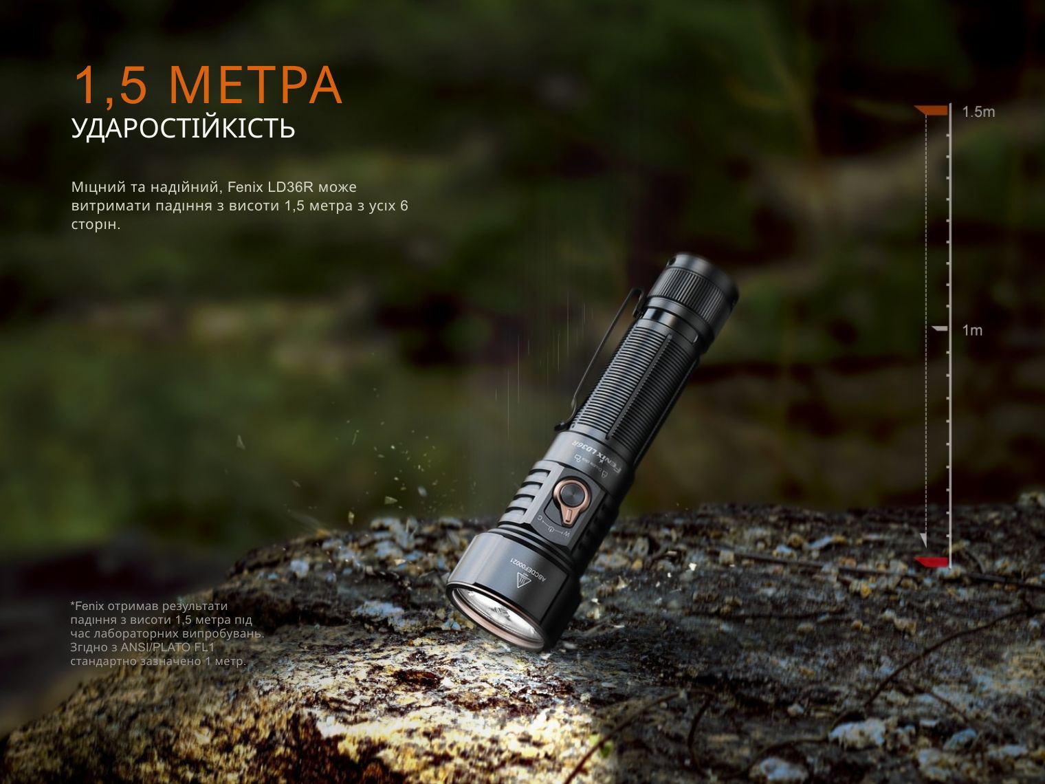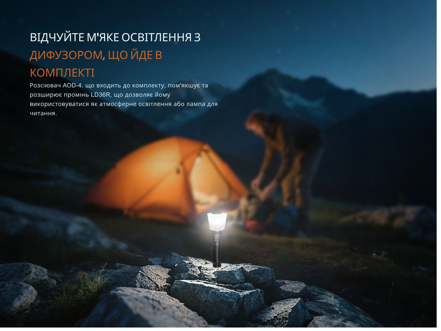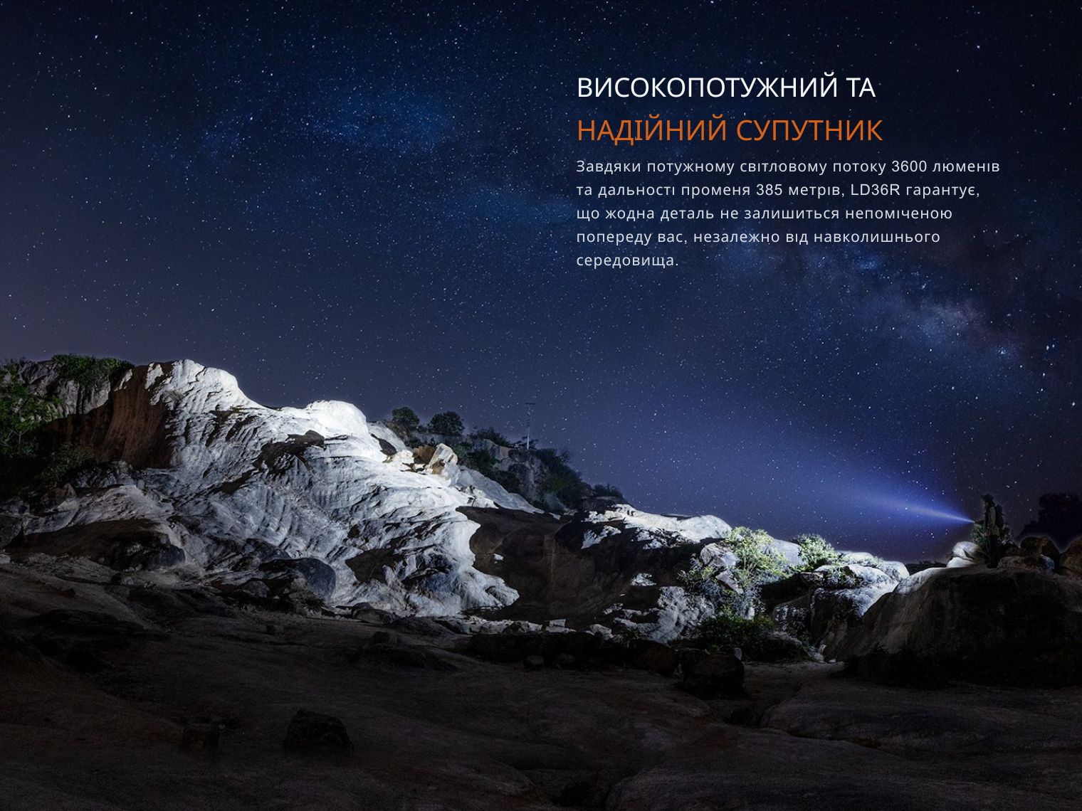 Комплектація | Fenix LD36R, аккумулятор ARB-L21-6000, зарядный кабель USB-С, диффузионный фильтр AOD-04, запасное уплотнительное кольцо, чехол, темляк, инструкция |
