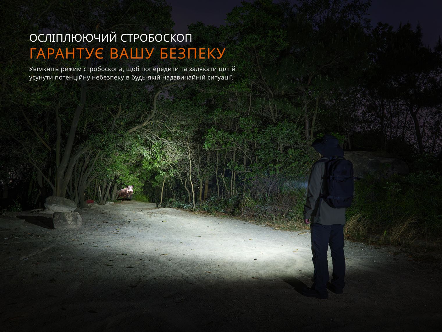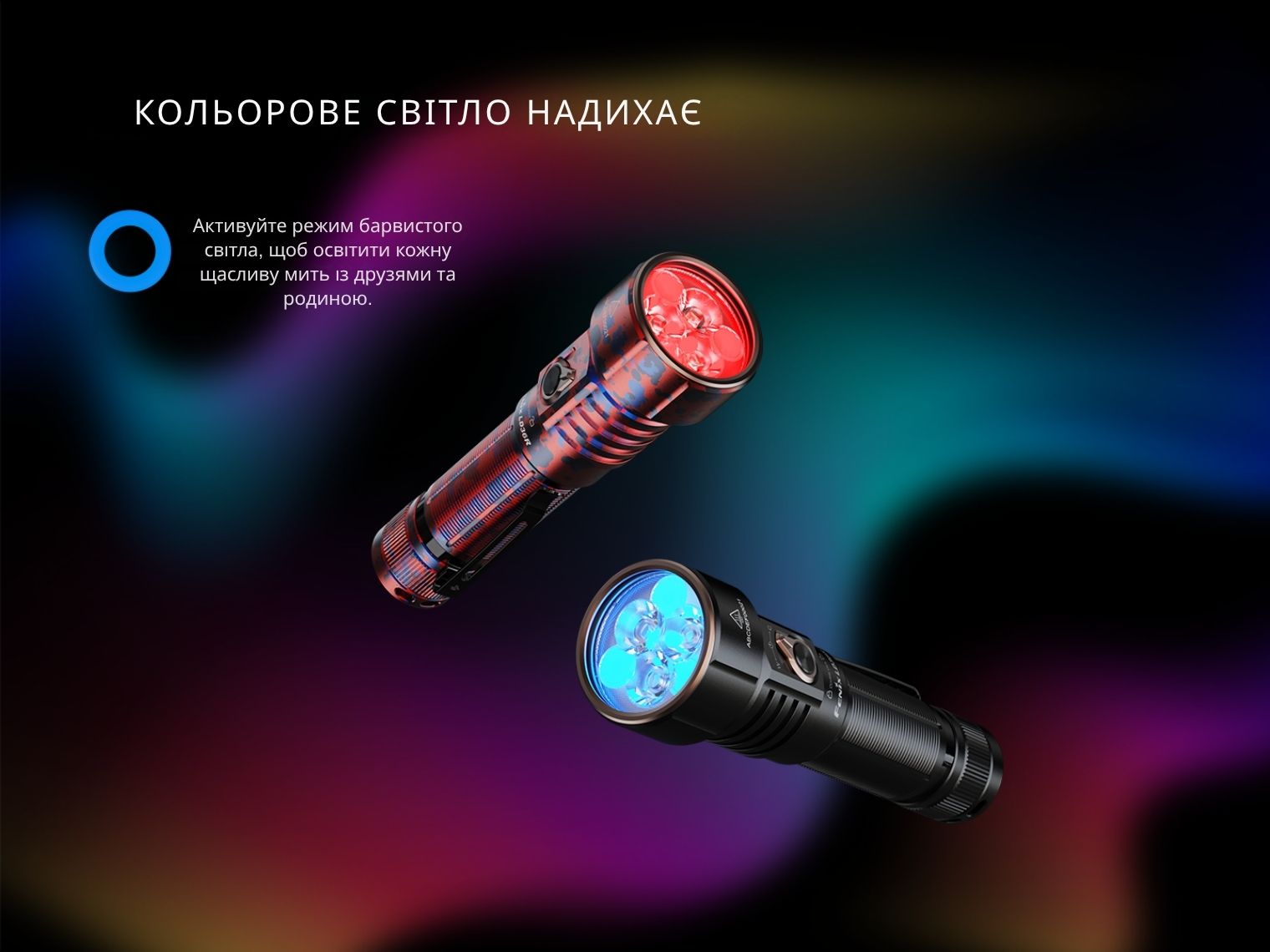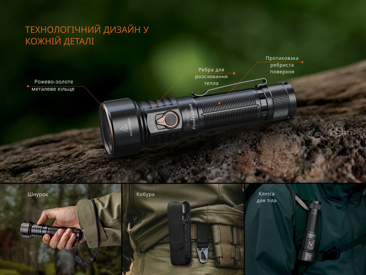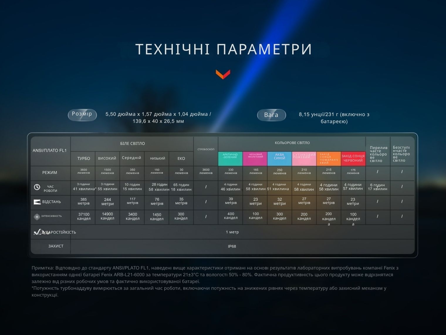 Комплектація | Fenix LD36R, аккумулятор ARB-L21-6000, зарядный кабель USB-С, диффузионный фильтр AOD-04, запасное уплотнительное кольцо, чехол, темляк, инструкция |