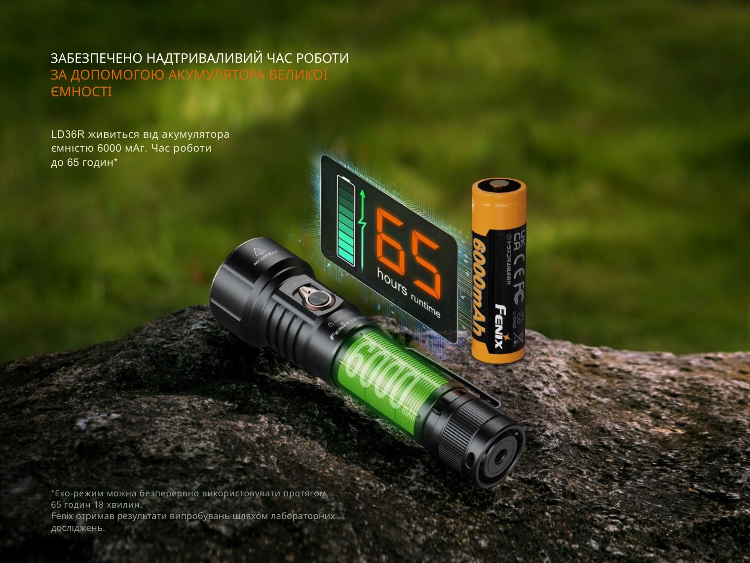 Fenix LD36R живиться від надʼємного акумулятора Fenix на 6000 мАгод (є в комплекті). Інтелектуальний захист унеможливлює ламання електроніки у разі встановлення батареї неправильною стороною.