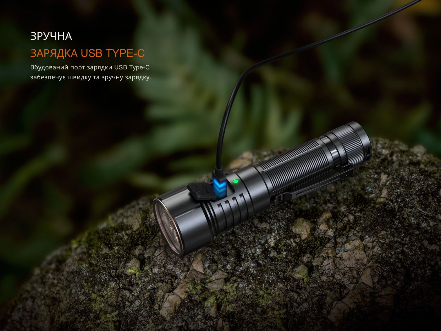 Акумулятор заряджається через вологозахищений порт USB-C у голові ліхтаря. Час заряджання становить 3.5 год за умови використання зарядного адаптера 5 В/2.5 А.