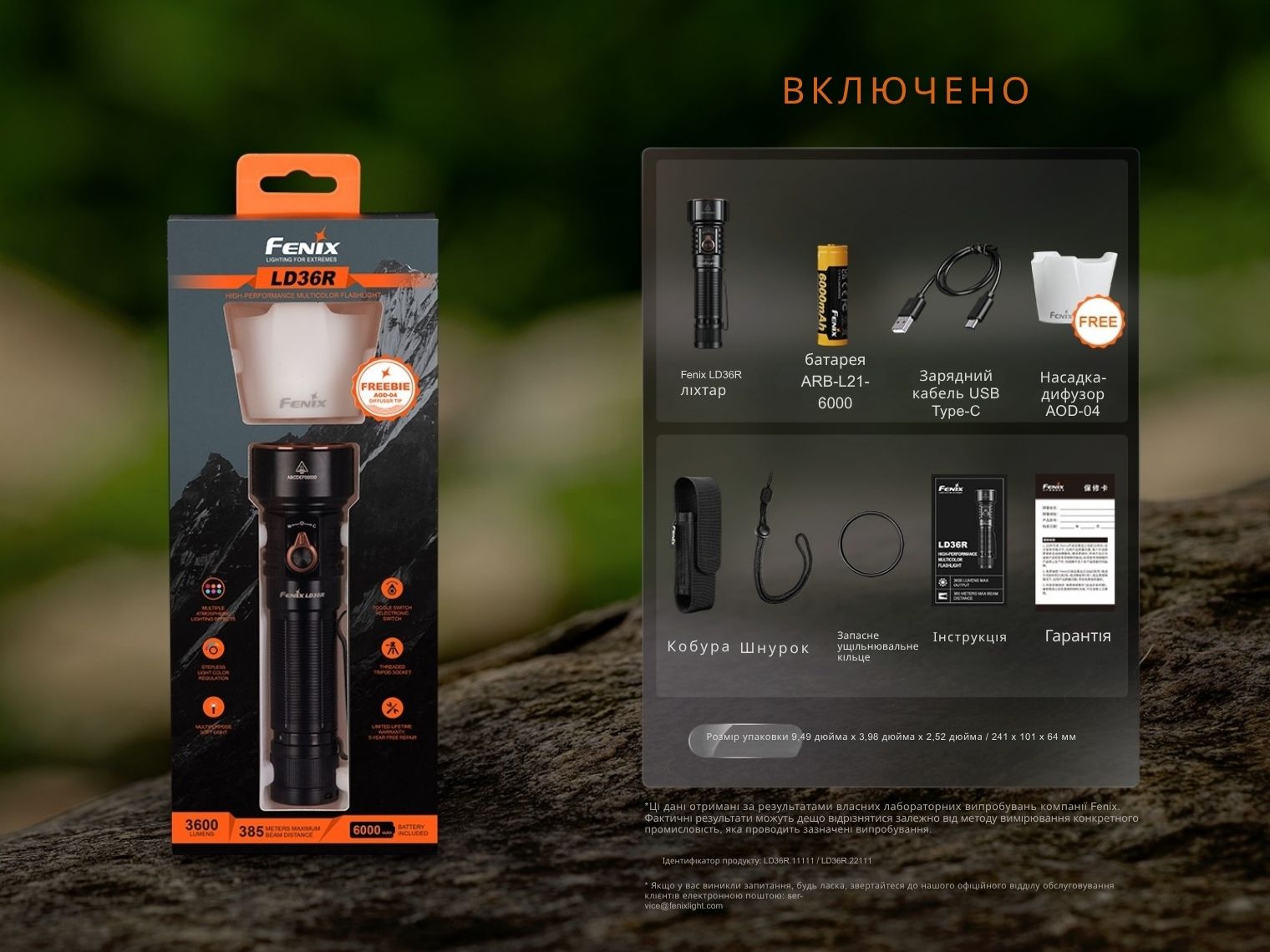Ліхтар Fenix LD36R, акумулятор ARB-L21-6000, зарядний кабель USB-С, дифузійний фільтр AOD-04, запасне ущільнювальне кільце, чохол, темляк, посібник користувача, гарантійний талон.