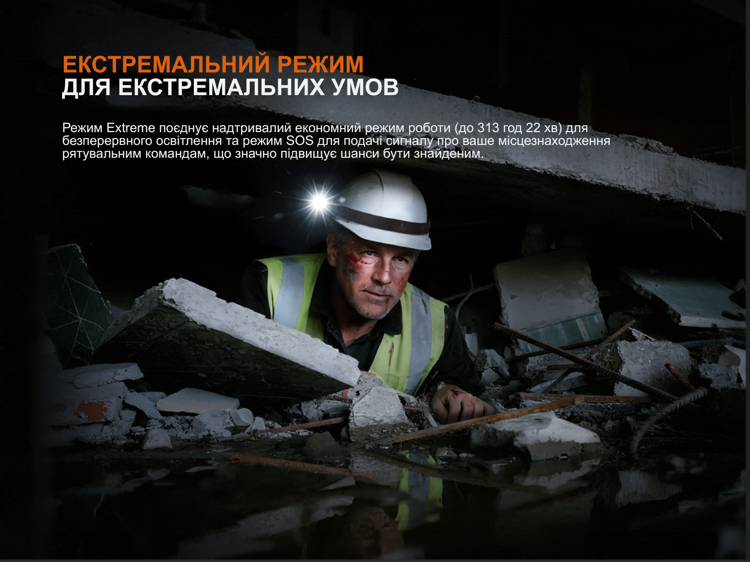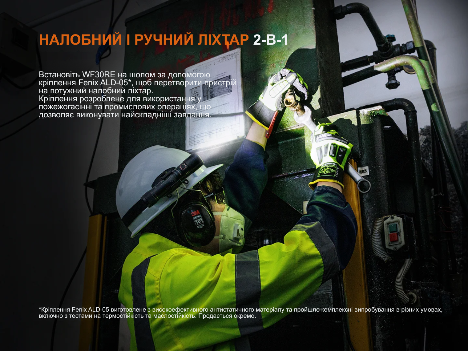 Ліхтар можна використовувати як налобний, закріпивши його на касці чи шоломі за допомогою кріплення Fenix ALD-05 (купується окремо).