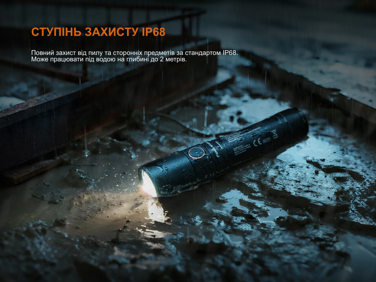 Корпус виготовлено з ударостійкого та антистатичного матеріалу, що виключає ризик появи іскор при ударах чи терті. Модель повністю герметична за стандартом IP68 (витримує занурення до 2 м на 30 хв) та захищена від падіння з висоти 1 м.