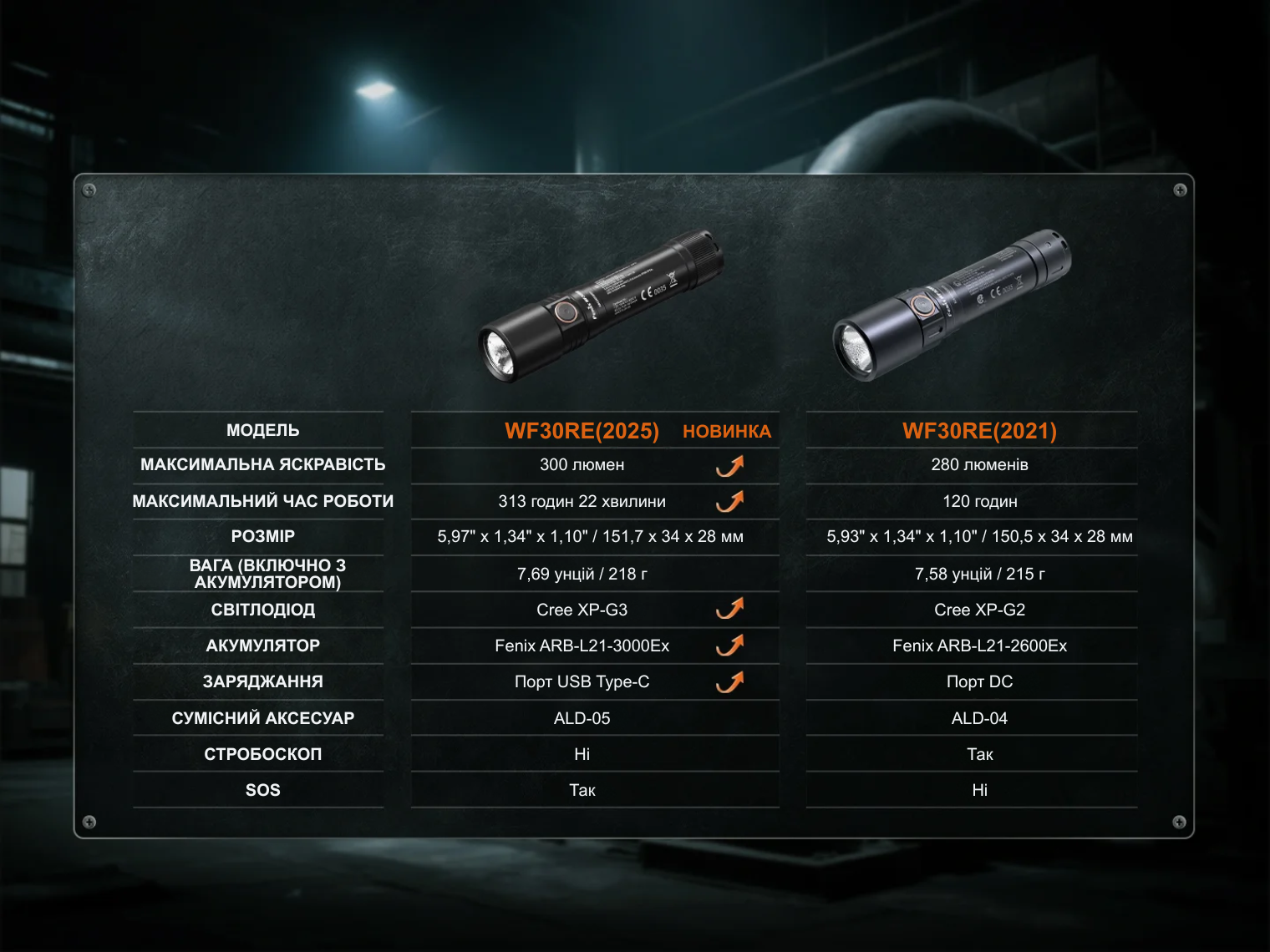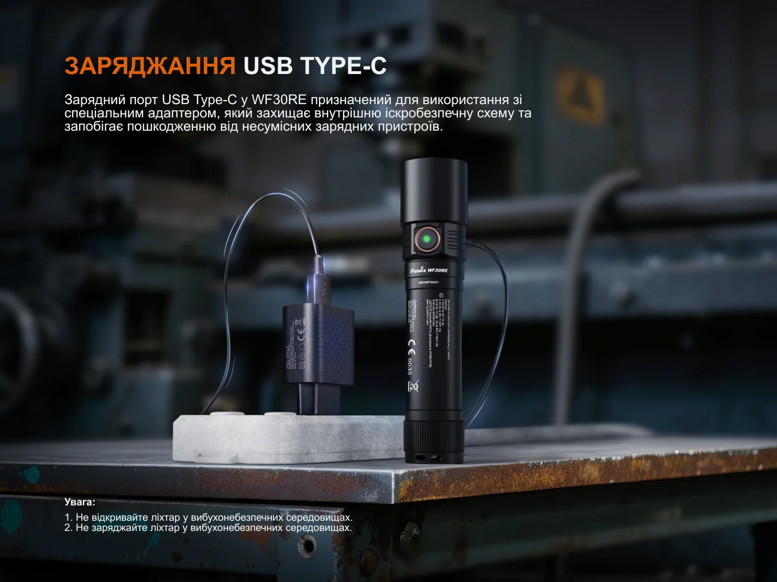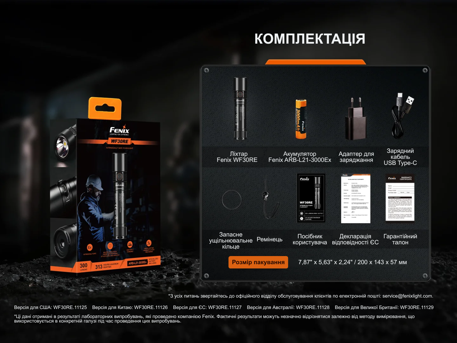 Комплектація | Fenix WF30RE Spark, аккумулятор Fenix ARB-L21-3000Ex, адаптер питания, кабель для зарядки USB Type-C, ремешок на руку, запасное уплотнительное кольцо, инструкция |